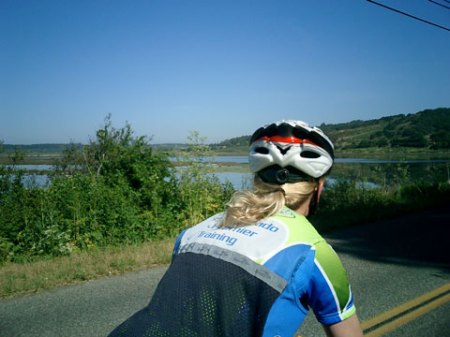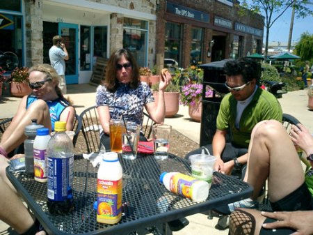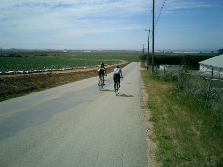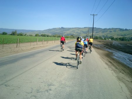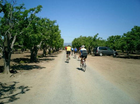 OK, we decided to spare you the sight of two dozen cyclists wolfing down way too much pie and ice cream. It wasn’t pretty. This is us wobbling away from the Gizdich Ranch pie shop, afterwards.