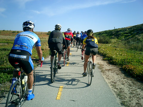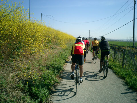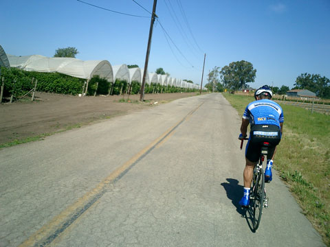 OK, we decided to spare you the sight of two dozen cyclists wolfing down way too much pie and ice cream. It wasn’t pretty. This is us wobbling away from the Gizdich Ranch pie shop, afterwards.