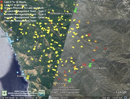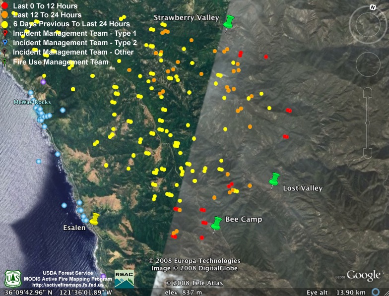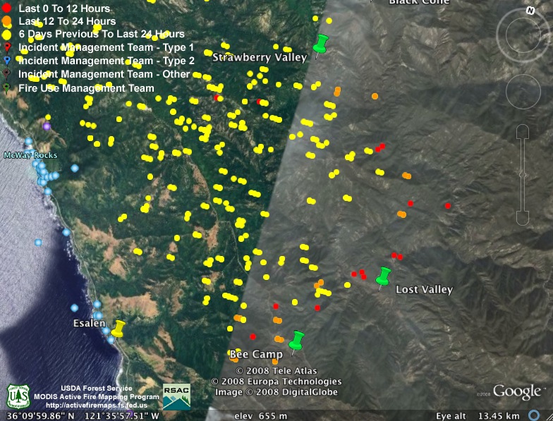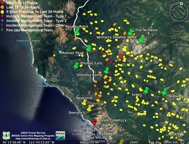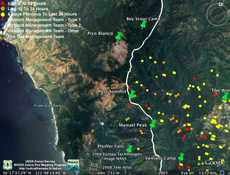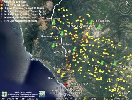 I’m posting the aerial infrared maps from the evening before on my site. I get them off a server about 7:00 AM and post them on my Basin Fire page. They are in kml format for Google Earth and Maps. They are tracking the MODIS information very well, except for this weirdness on the hillside above Big Sur. Maybe that area has vortex’s like in Sedona, AZ :-)