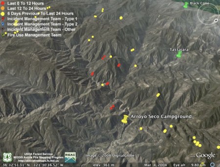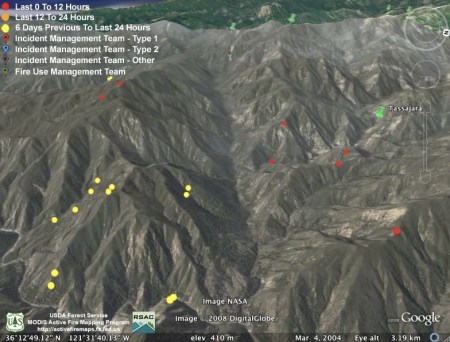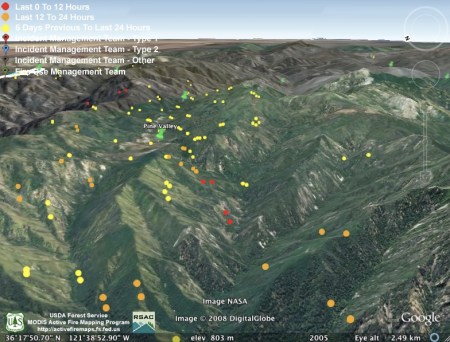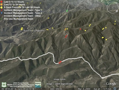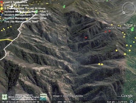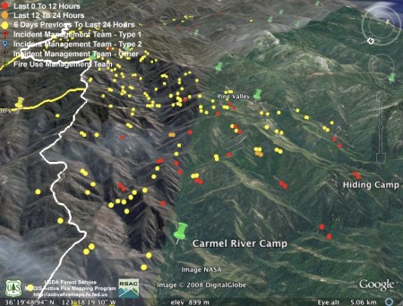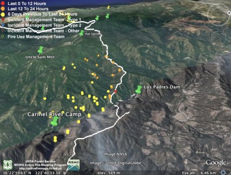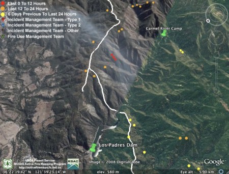 They obviously weren’t kidding about backfiring the rest of Hennickson’s Ridge from Chew’s Ridge to the Los Padres Dam today. According to MODIS, the whole section is fully ablaze this afternoon – with fire stretching from upper Miller Canyon all the way through Pine Valley to the Carmel River. Assuming this backfire doesn’t get away from them (we hear there was a bit of a close call with the backfire yesterday), it looks like they might have this fire just about wrapped up: