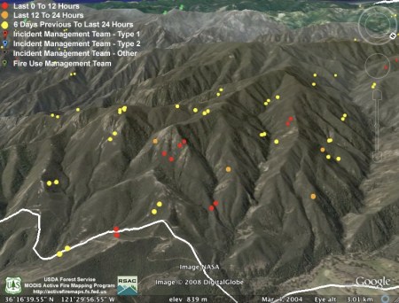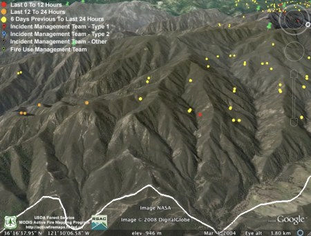 We’re more concerned about there only being two detections. For the backfire to be effective, it needs to be hot enough to burn most of the available fuel. Backfires that have accomplished this in the past have always provided MODIS with many more heat detections than we’re seeing here. So were these fires just smaller than backfires of the past, and did they do most of their burning between satellite passes? Or, after the heavy marine layer of the past few days, are things still reluctant to burn?