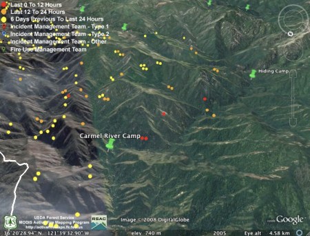 The only hot spots mapped by MODIS in the past 12 hours have been near the Carmel River in the Miller Mountain area:
