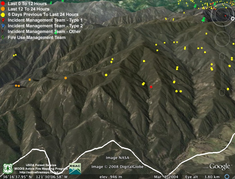 Clarification to my comment above: I’m not actually looking at the fire; I’m looking at another MODIS image, which shows more red than in the jpg image at 8:15 at the top of this site.