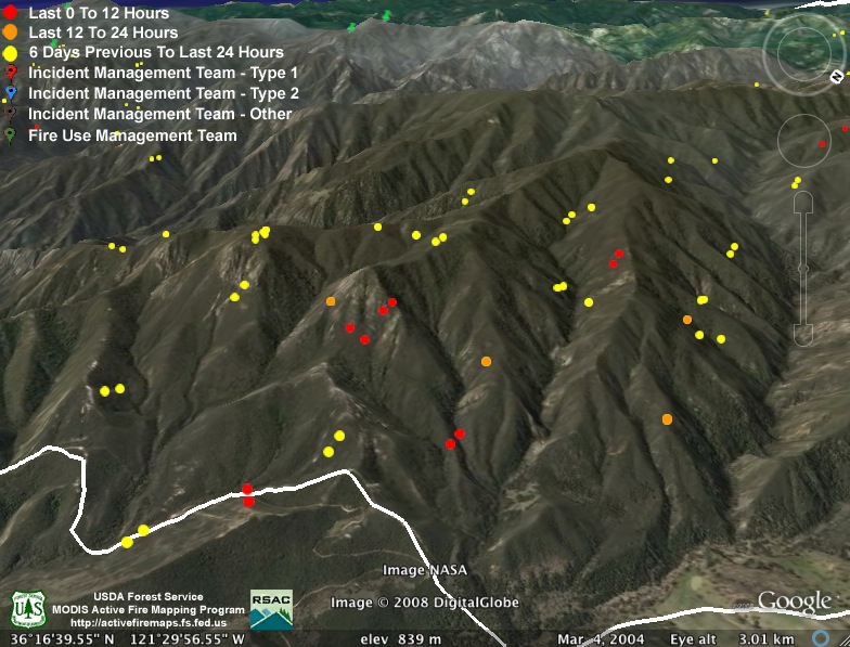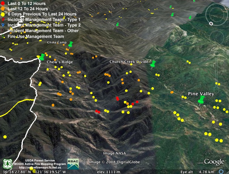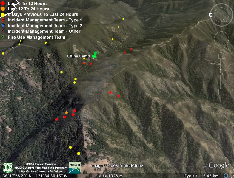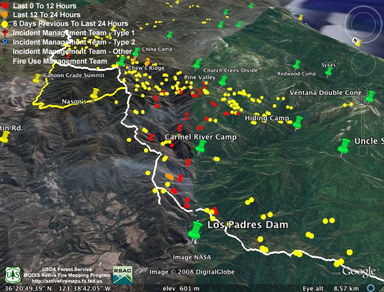 They obviously weren’t kidding about backfiring the rest of Hennickson’s Ridge from Chew’s Ridge to the Los Padres Dam today. According to MODIS, the whole section is fully ablaze this afternoon – with fire stretching from upper Miller Canyon all the way through Pine Valley to the Carmel River. Assuming this backfire doesn’t get away from them (we hear there was a bit of a close call with the backfire yesterday), it looks like they might have this fire just about wrapped up:
