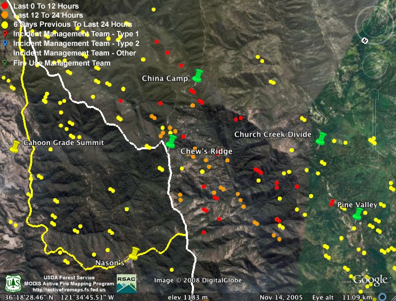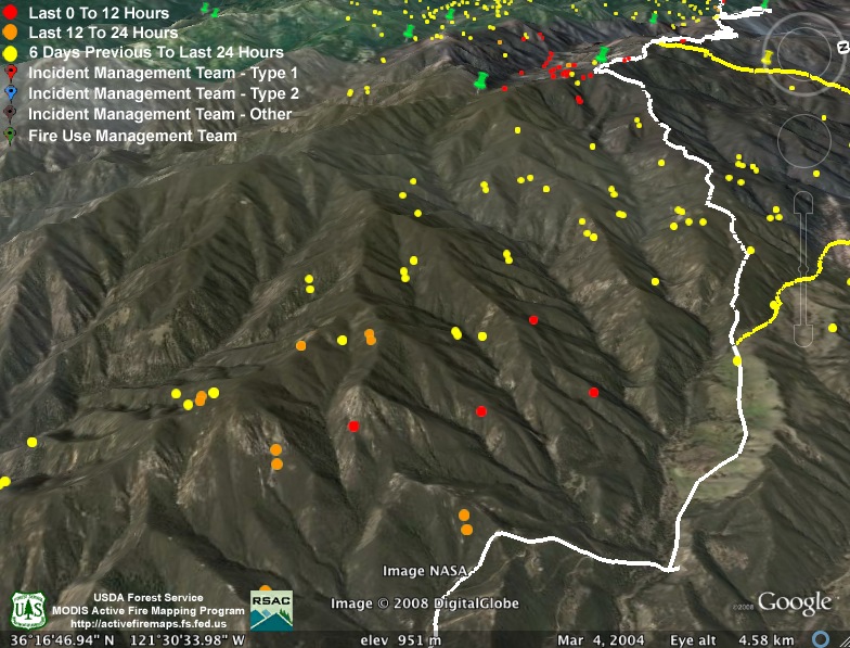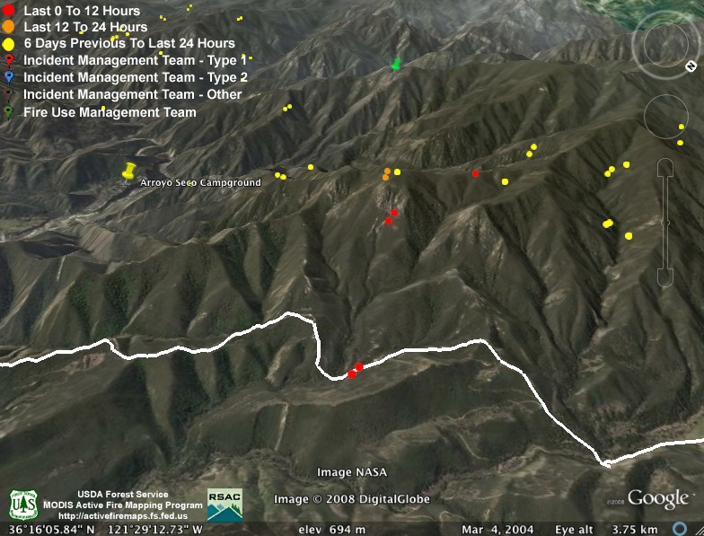 We’re more concerned about there only being two detections. For the backfire to be effective, it needs to be hot enough to burn most of the available fuel. Backfires that have accomplished this in the past have always provided MODIS with many more heat detections than we’re seeing here. So were these fires just smaller than backfires of the past, and did they do most of their burning between satellite passes? Or, after the heavy marine layer of the past few days, are things still reluctant to burn?