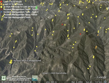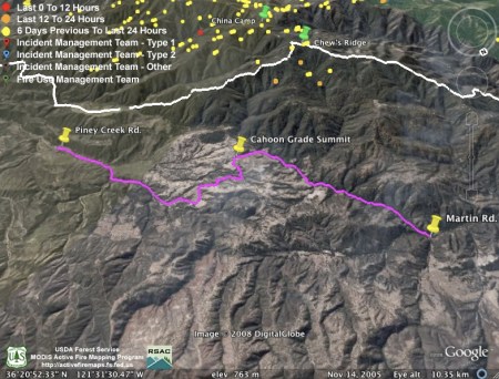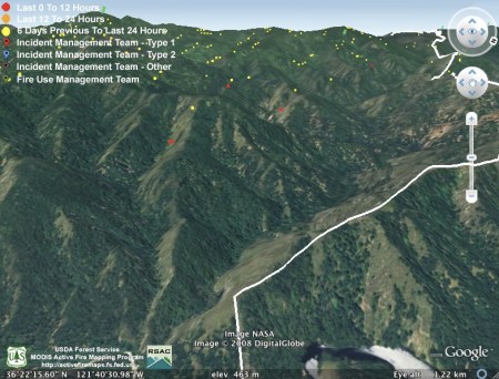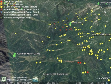 As has been the usual pattern during this fire, heat detections have dropped off during the day. Since most of the interest this evening is on the new mandatory evacuation called for tomorrow morning, we’re providing a Google Earth screen capture with the portion of the Carmel Valley Rd. subject to the evacuation drawn in purple. The white line depicts the approximate location of the main fire line. We have not attempted to depict the location of the new fire lines being constructed to contain the “slop over” fire, as we have not seen any good enough data on that yet. We hope this will give some sense of where this section of the road is in relation to the fire: