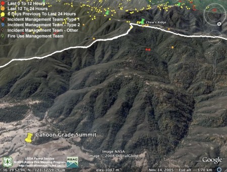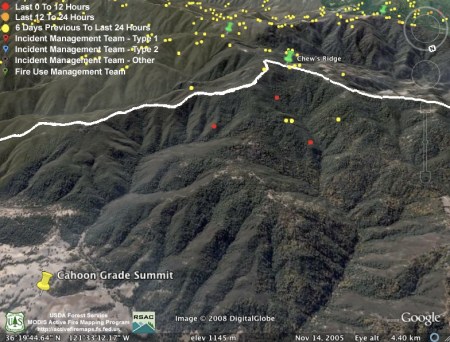 The only new heat detections overnight were on the northern end of the fire. Unfortunately, this includes the part of the fire over the fire lines on Chew’s Ridge. That fire appears to still be actively burning in Anastasia Canyon and to have moved east into the headwaters of Finch Creek as well. If this spread to the east is real, we hope it’s inside the new dozer lines they’re building to contain this fire (we’d been kind of figuring the dozer line would start down the ridge between Finch and Anastasia, then cut across Anastasia toward Lambert Flats). Too bad that when they say they’re building a new dozer line they don’t explain where: