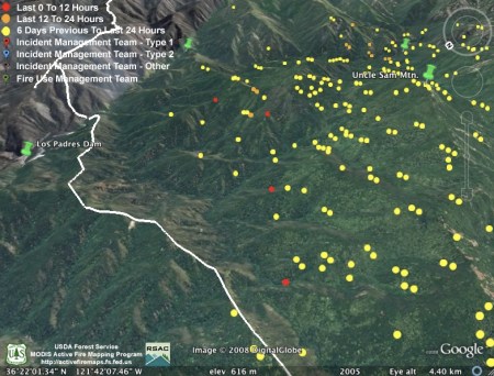 Clarification to my comment above: I’m not actually looking at the fire; I’m looking at another MODIS image, which shows more red than in the jpg image at 8:15 at the top of this site.