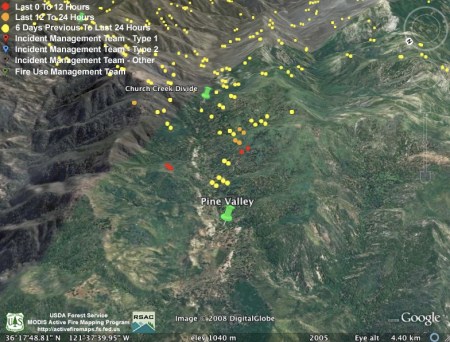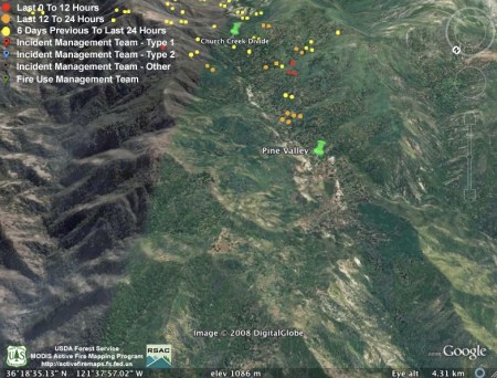 Moving west, MODIS also found the fire between Pine Valley and the Church Creek Divide still burning very actively: