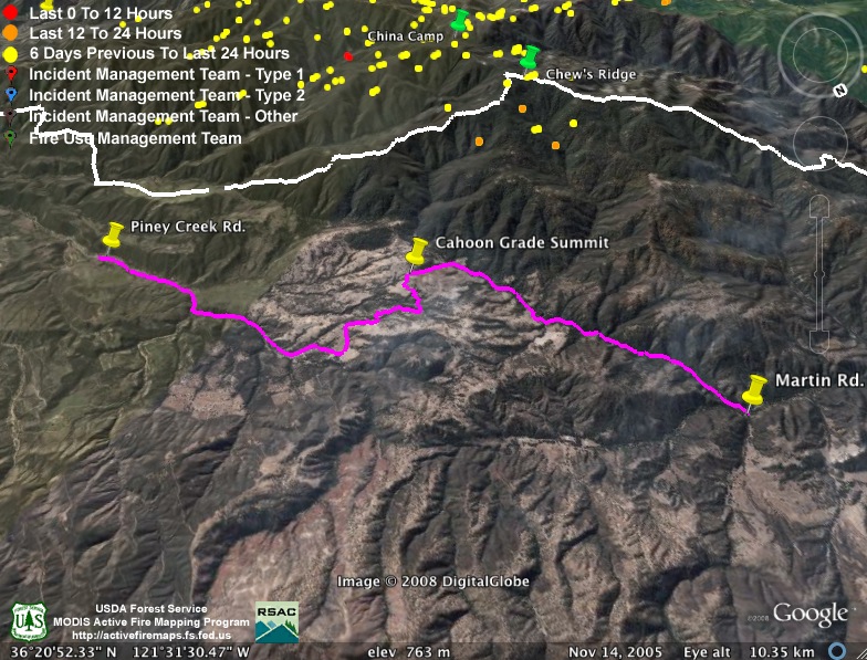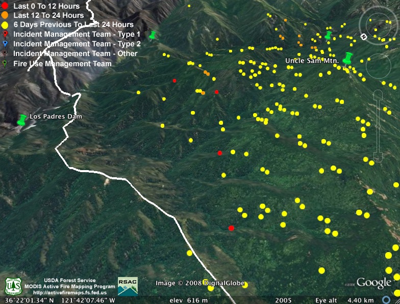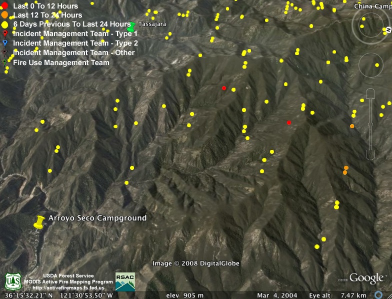 As has been the usual pattern during this fire, heat detections have dropped off during the day. Since most of the interest this evening is on the new mandatory evacuation called for tomorrow morning, we’re providing a Google Earth screen capture with the portion of the Carmel Valley Rd. subject to the evacuation drawn in purple. The white line depicts the approximate location of the main fire line. We have not attempted to depict the location of the new fire lines being constructed to contain the “slop over” fire, as we have not seen any good enough data on that yet. We hope this will give some sense of where this section of the road is in relation to the fire: