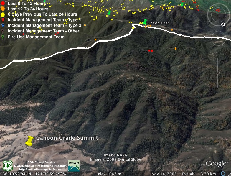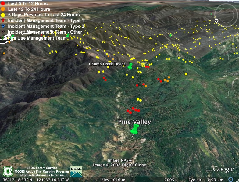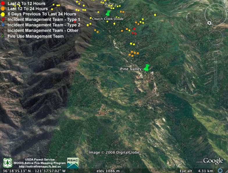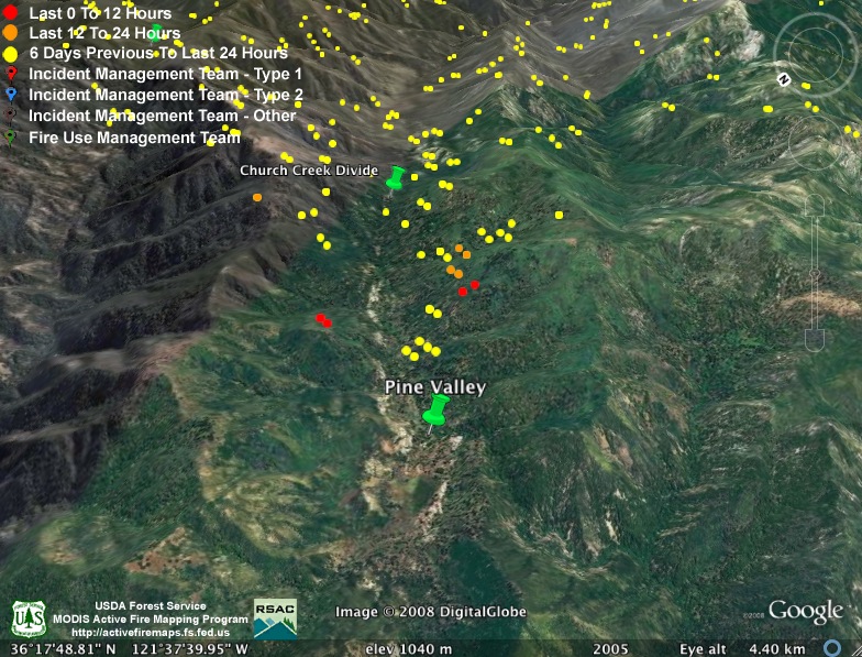 Moving west, MODIS also found the fire between Pine Valley and the Church Creek Divide still burning very actively: