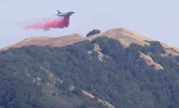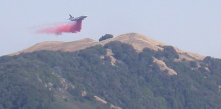 At the Palo Colorado Community Meeting, meanwhile, residents were told that work on the northwestern lines had been slower than hoped today, but that the backfiring is scheduled to begin at 10:00AM tomorrow; working from Skinner Ridge west. A hand line has been completed down Long Ridge (the “contingency line” route) and they will be putting dozers on it tomorrow. The DC-10 arrived today and made a couple of passes painting the Mescal Ridge line. Each pass is reputed to cover a mile. And Lloyd Jones even sent us a pic: