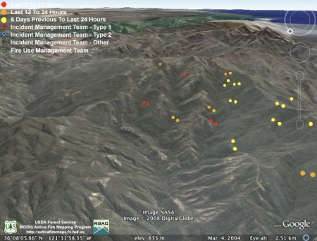 Thanks for the idea of using the MODIS overlay data with Google Earth. I posted more kml files on my site including the recreation map for the northern Los Padres.