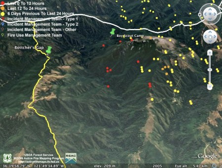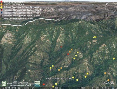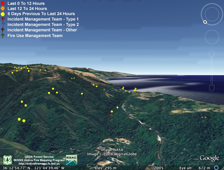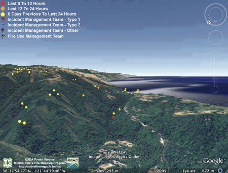 I’m posting the aerial infrared maps from the evening before on my site. I get them off a server about 7:00 AM and post them on my Basin Fire page. They are in kml format for Google Earth and Maps. They are tracking the MODIS information very well, except for this weirdness on the hillside above Big Sur. Maybe that area has vortex’s like in Sedona, AZ :-)