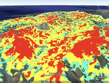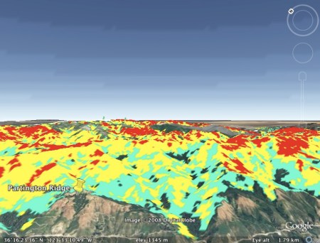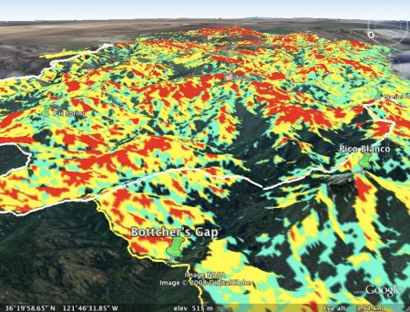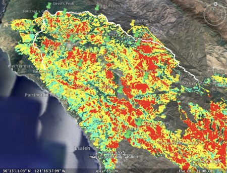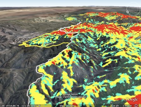 Here’s a Google Earth overlay version giving an overview of the Basin Fire. As you might expect, red indicates an intense burn, yellow a moderate burn and green a low burn.
