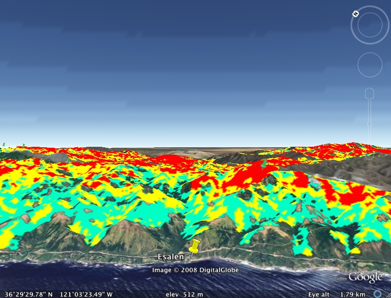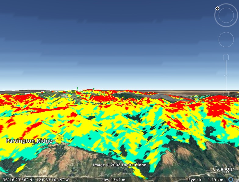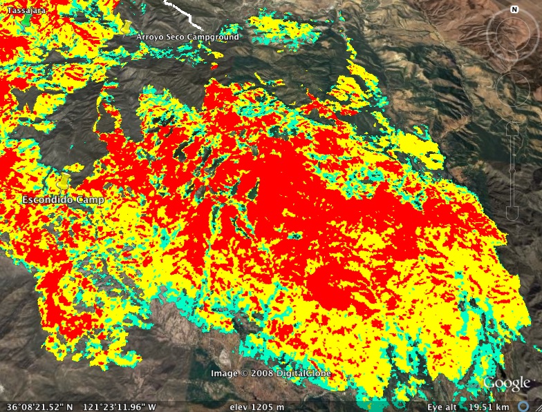 Here’s a Google Earth overlay version giving an overview of the Basin Fire. As you might expect, red indicates an intense burn, yellow a moderate burn and green a low burn.