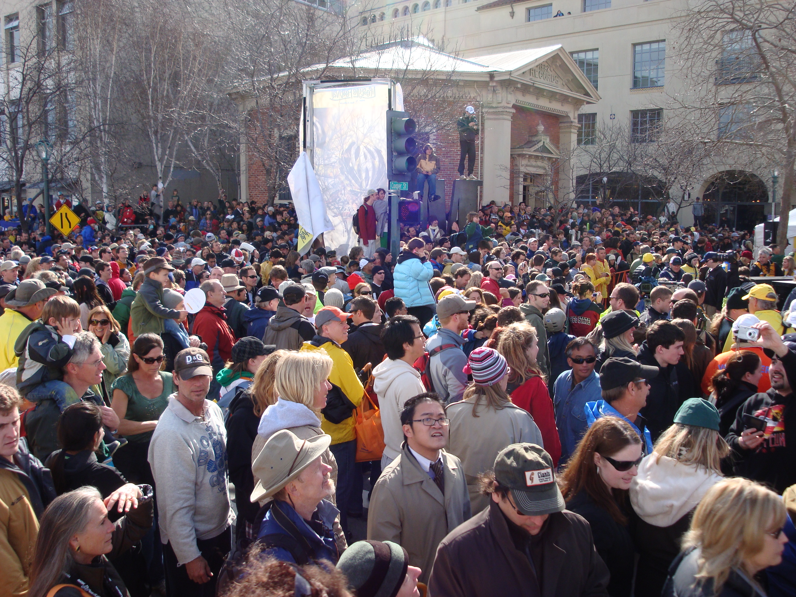 Crowds pack the streets of Santa Cruz for the finish of Stage 2 of the Tour of California. Not a bad turn-out for a day when sunshine kept alternating with hammering rain.