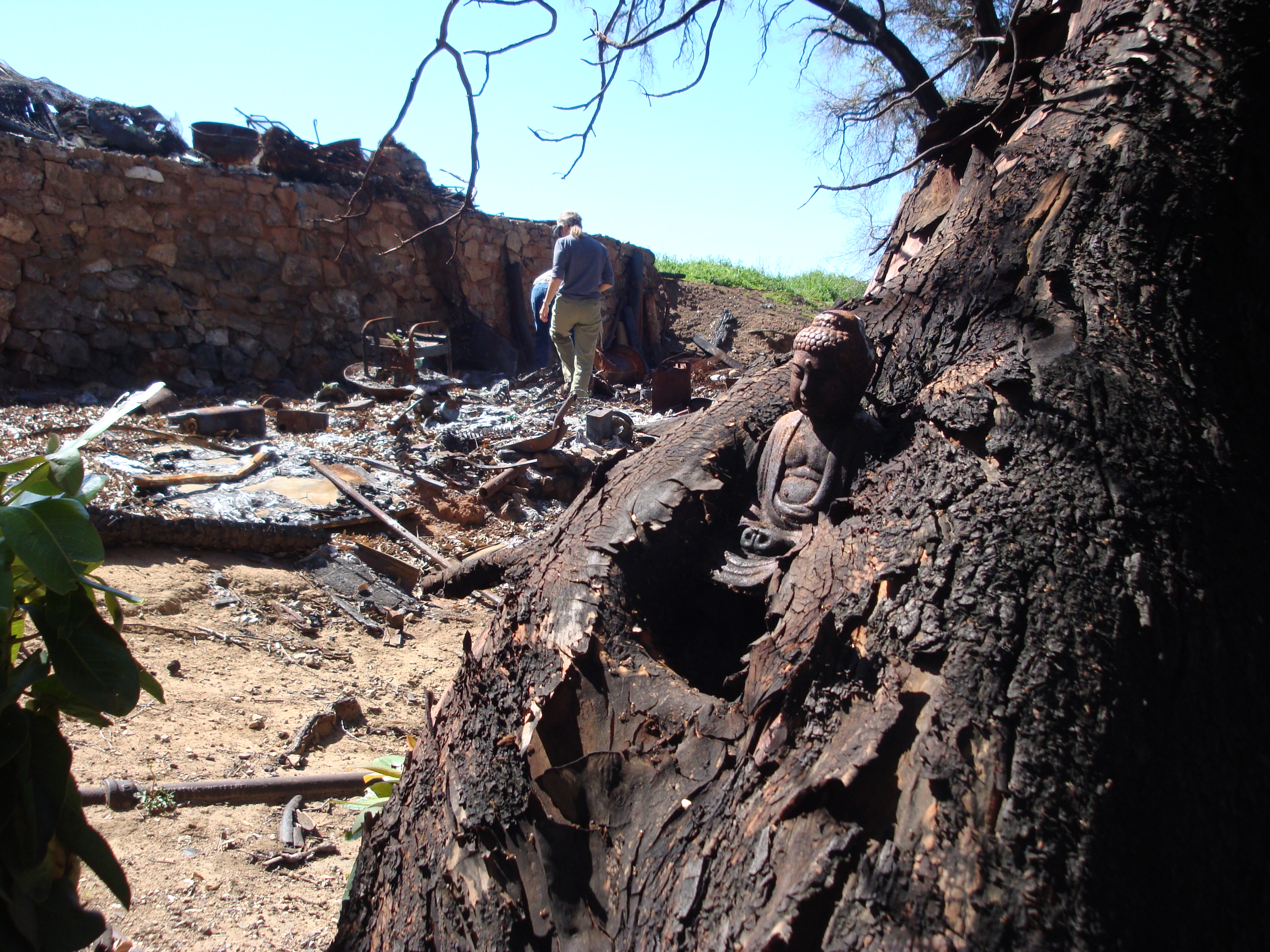 April 2, 2009: The barn is still a pile of rubble, but the madroño is leafing out from top to bottom and the buddha is swarming with ants.
