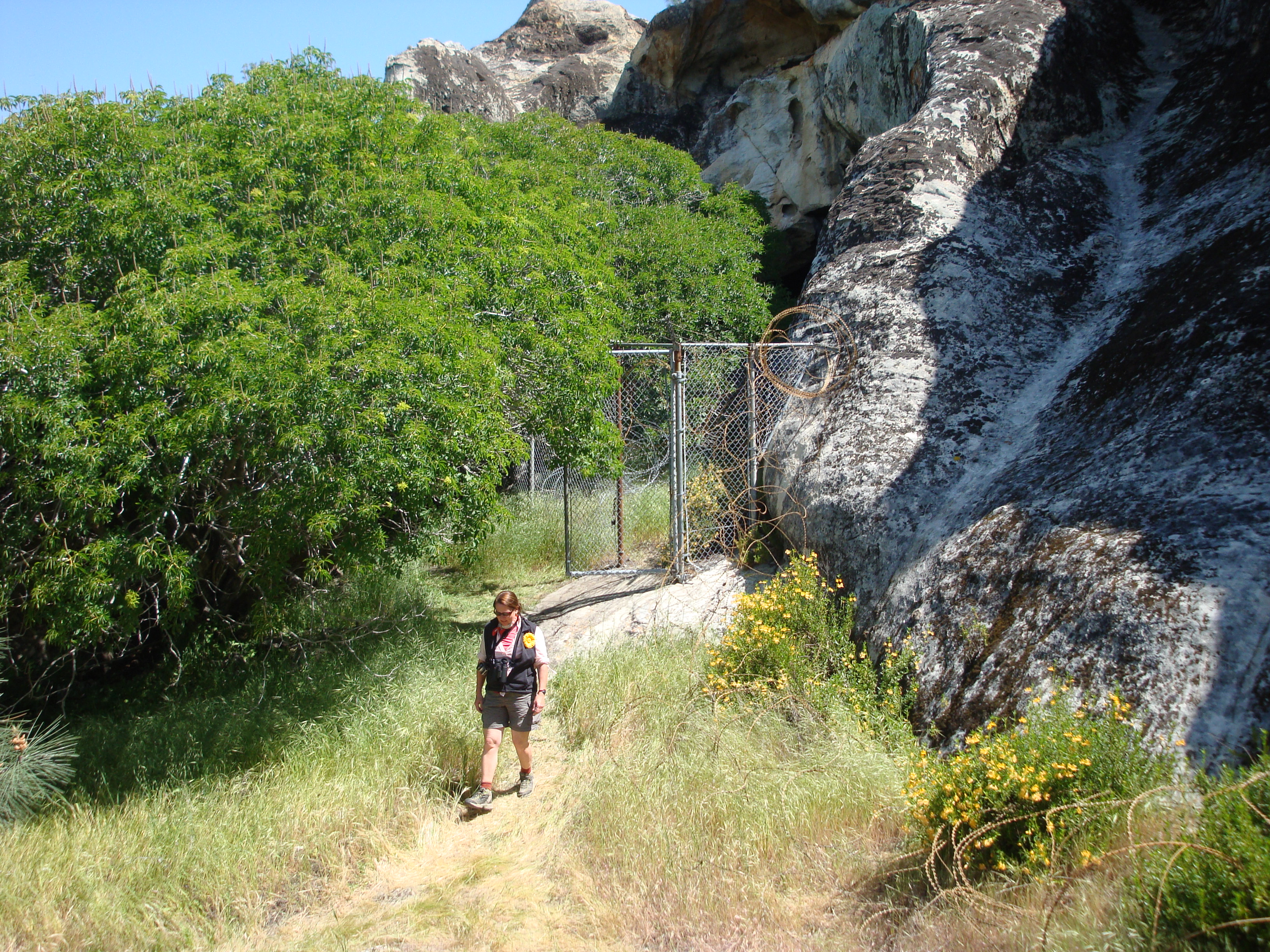 The army hasn’t allowed the public to visit La Cueva Pintada (on Fort Hunter Liggett) in something like 10 years, so when the San Antonio Valley Historical Association succeeded in navigating the bureaucratic maze and getting permission for a public tour a lot of people jumped at the opportunity. A lot more people than the Historical Association had been counting on. They’d told the army they’d be bringing about 20 people – but closer to 150 of us showed up. This initially caused a lot of consternation and high blood pressure among our hosts, but everyone, we’re glad to say, was eventually allowed to proceed to the cave. The guys on the right are taking pictures of a Mariposa Lily.