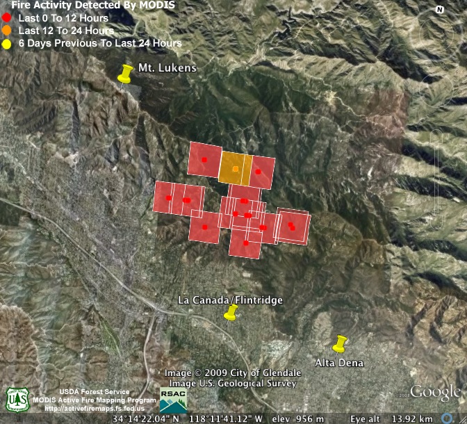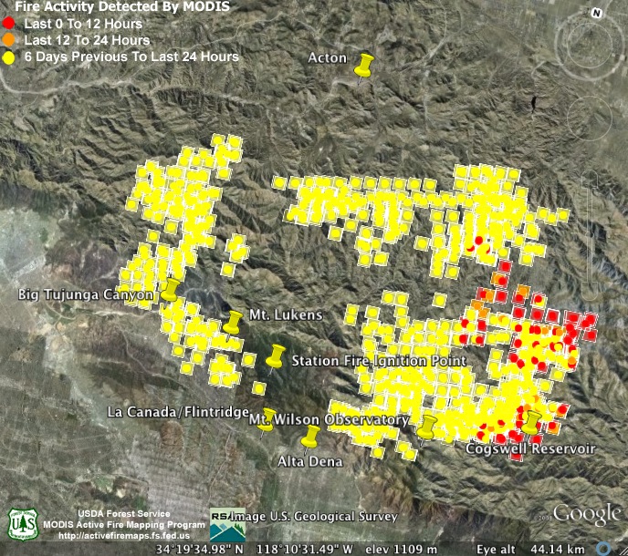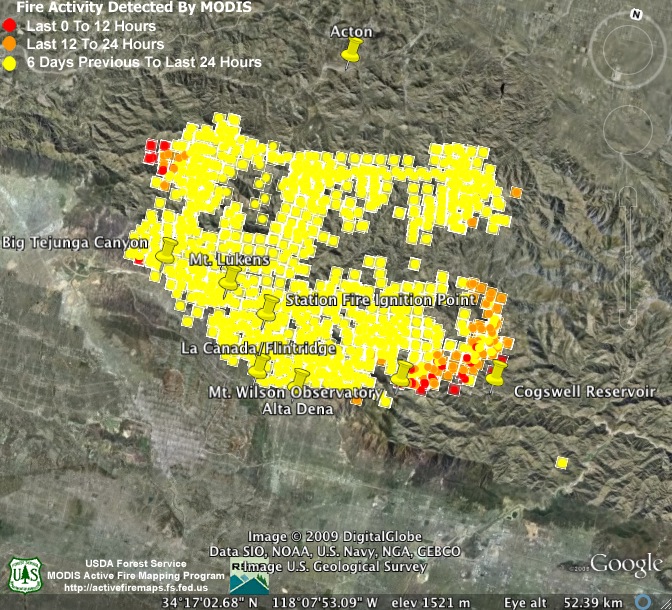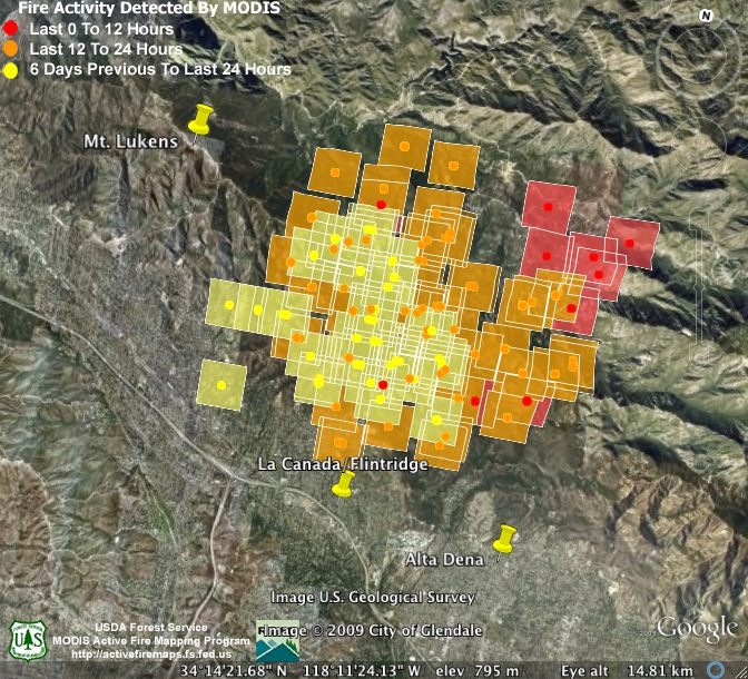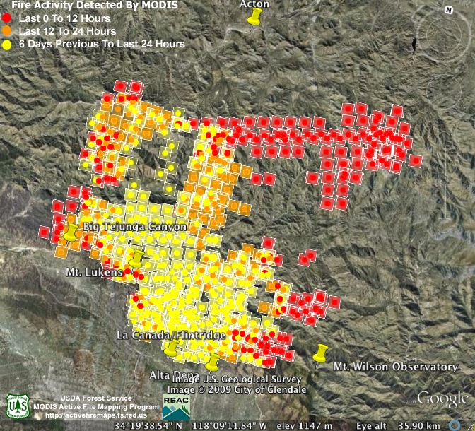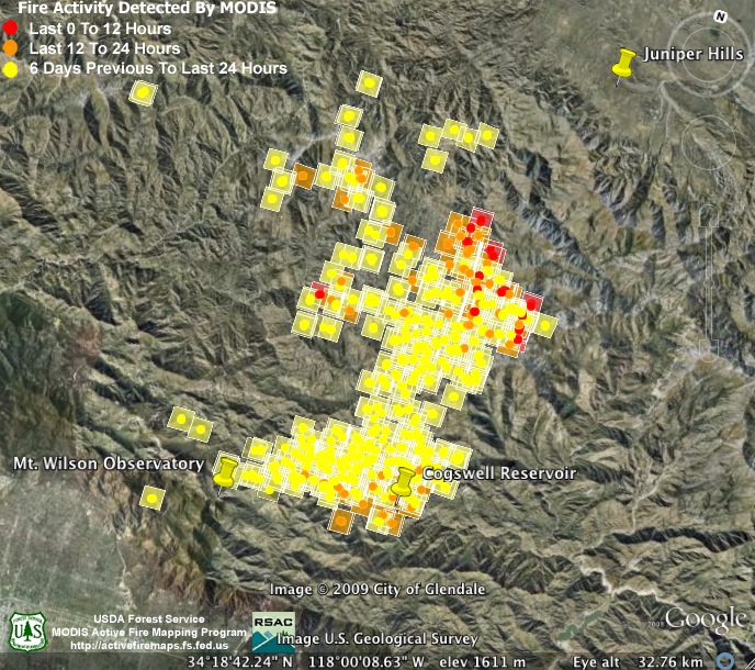 3:00am Monday, 9-7-09. Nearly all the new heat detections are deep in the mountains on the fire’s northeast end. This may change, though, as firefighters are hoping to secure the southern flank of the fire by conducting burnout operations today between Mt. Wilson and Cogswell Reservoir. The estimate of the fire’s size hasn’t changed this morning, but containment has crept up to 56%.