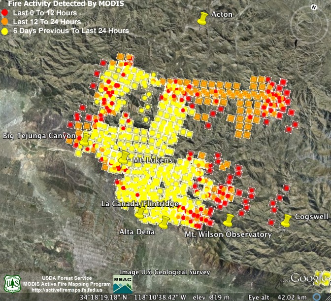 3:00am Thursday. Renewed fire activity north of Cogswell Reservoir and on the northeastern flank of the fire near Juniper Hills, but firefighters appear to be succeeding in their effort to keep the fire from descending Big Santa Anita Canyon (just southeast of Mt. Wilson). Fire still hot in the Magic Mountain area on the west and new evacuations are taking place in that vicinity. The fire has now burned more than 144,000 acres and containment is estimated at 38%.