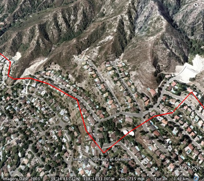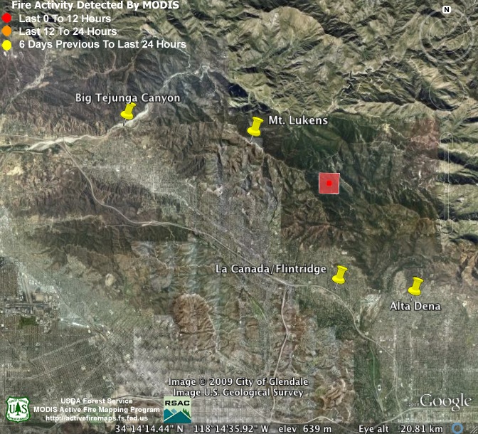 Even the incident command team, which has access to much better data and fire mapping technology, only tends to release woefully out of date and inaccurate fire maps to the public. Below is a corner of the most up-to-date official fire map currently available. It is dated 9-5-09 (2 days old) and is clearly not very accurate or precise. This neighborhood in La Crescenta, for example, did not burn as indicated by the map. On the contrary, local firefighters successfully backfired from the fringes of this neighborhood over a week ago. Why officials choose to put out maps with obvious errors like this we don’t know, but we’re not going to link to them here.