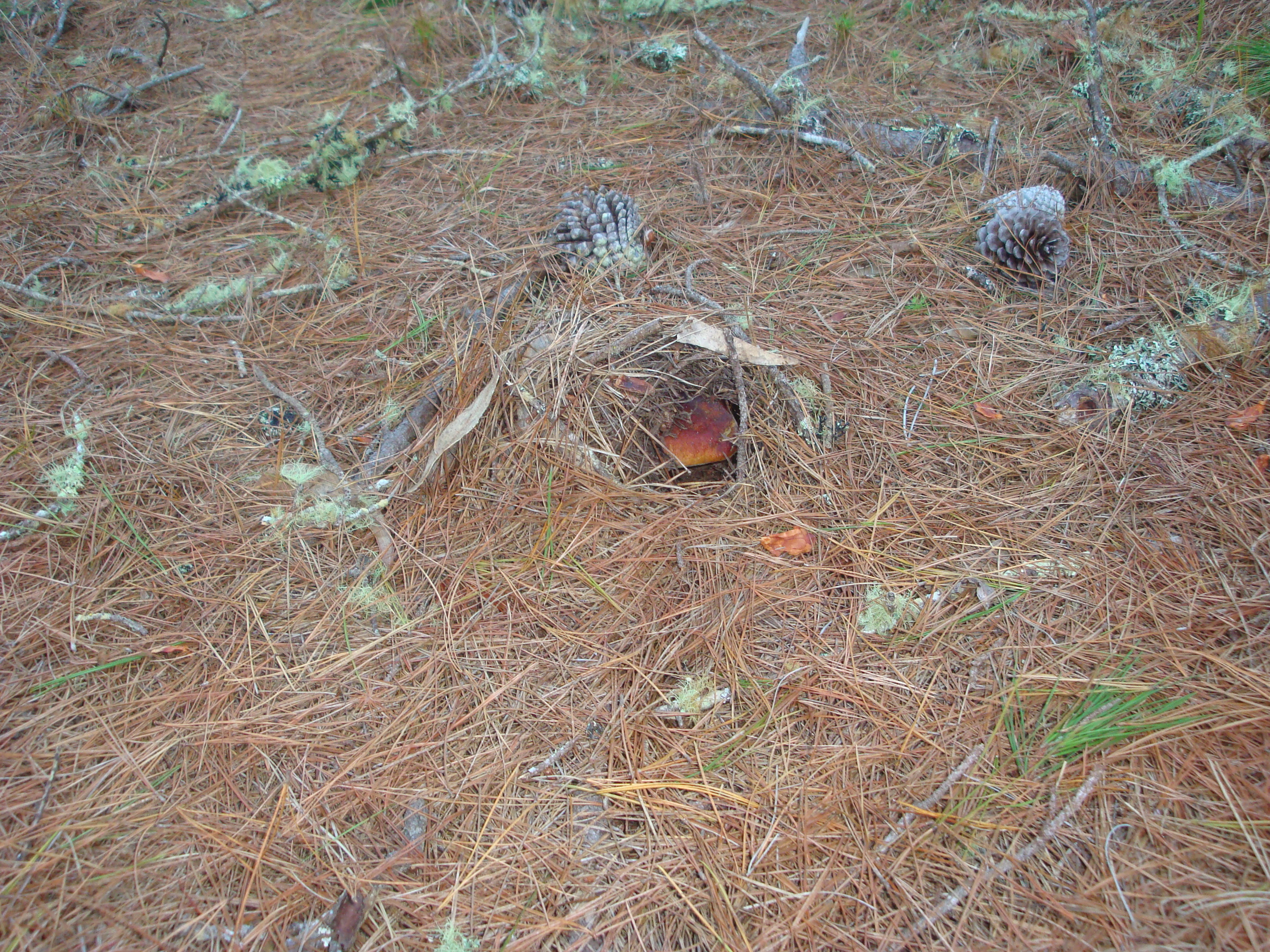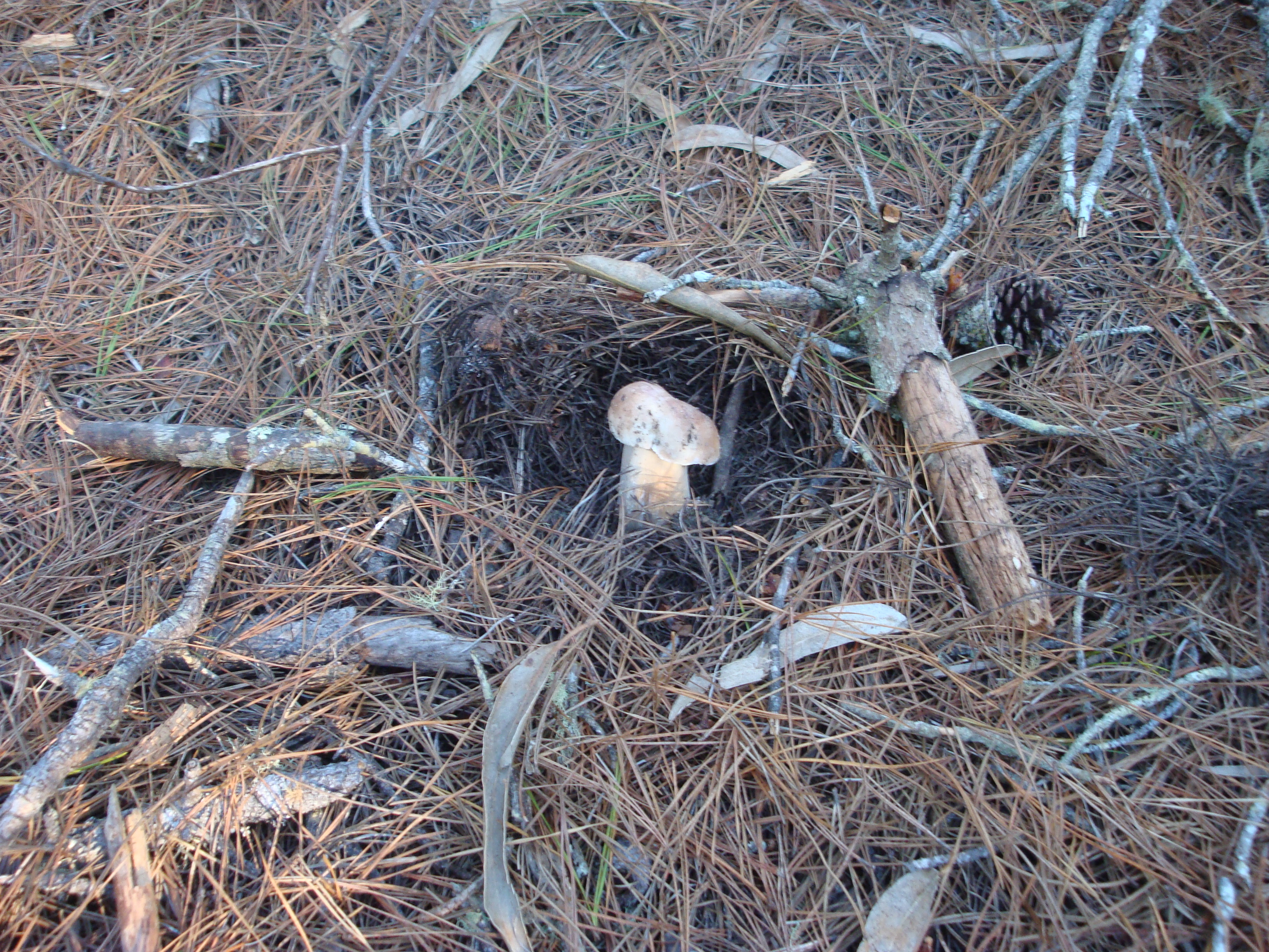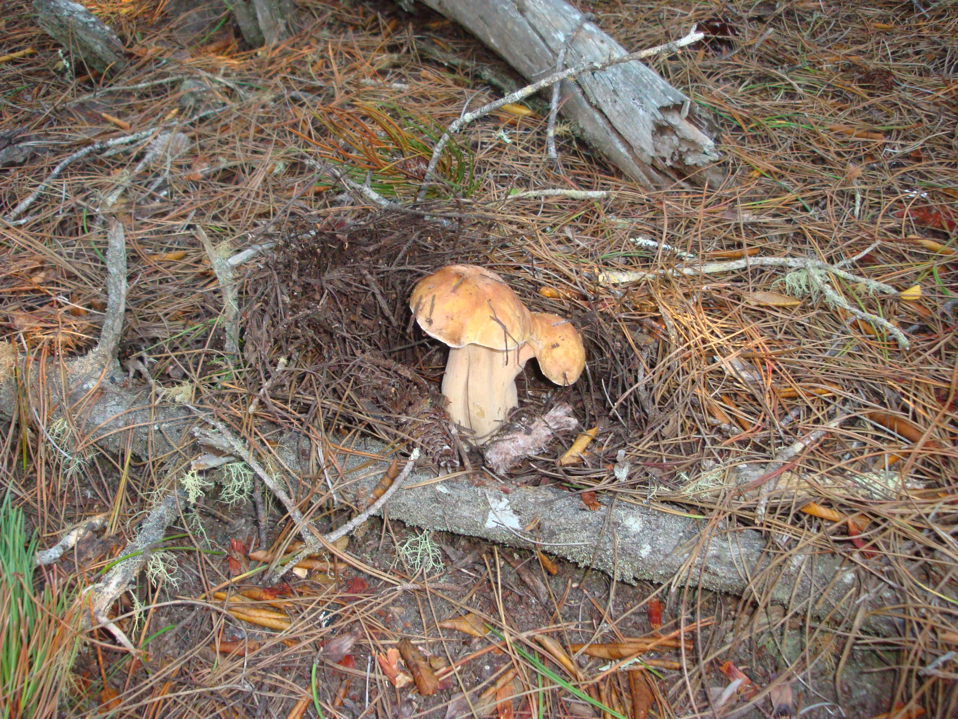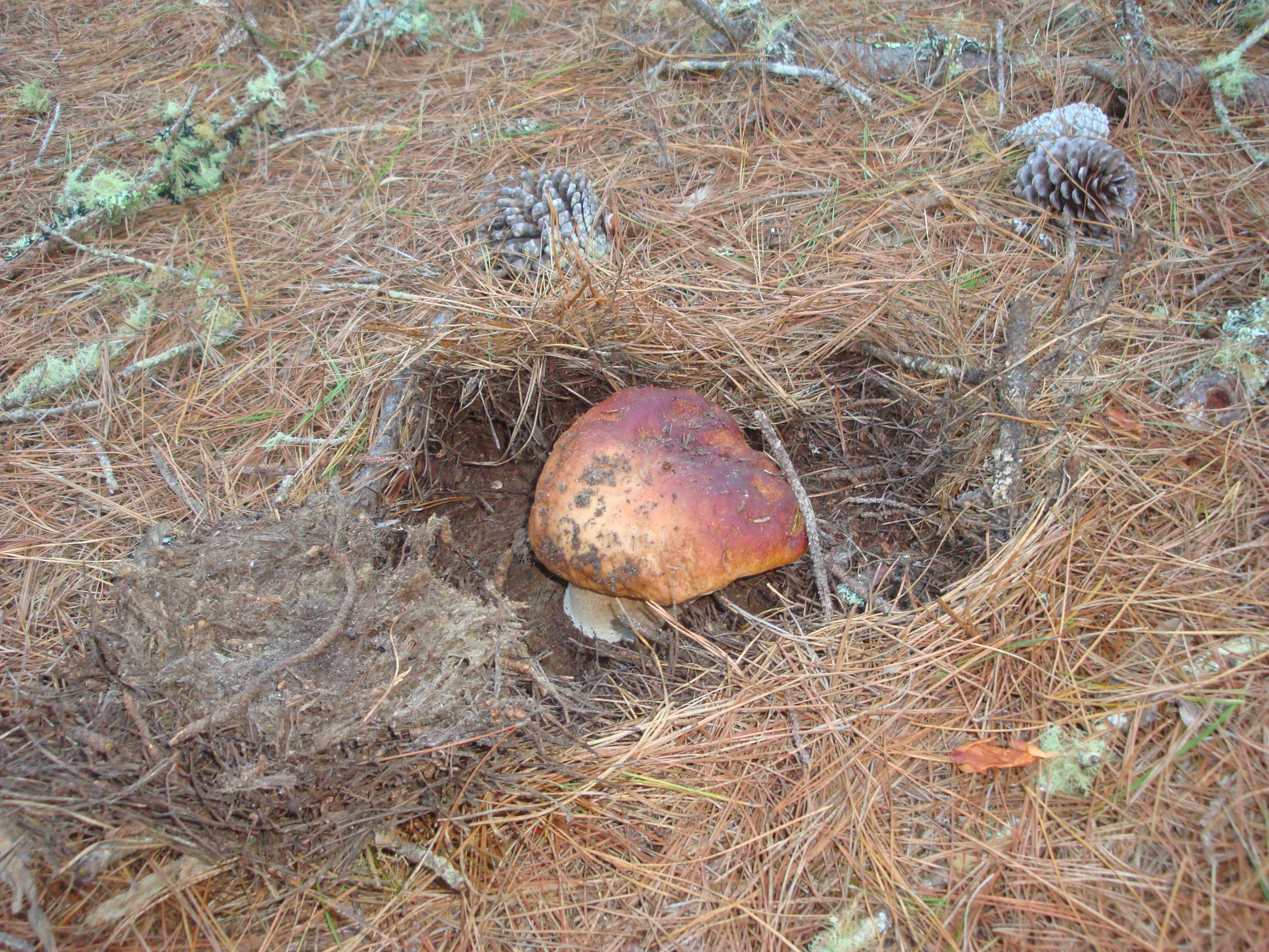 We’re liking what we’re seeing. We found a bolete button no bigger than a marble here and buried it under these handy green pine boughs. Now the mushroom appears to be pushing them aside.