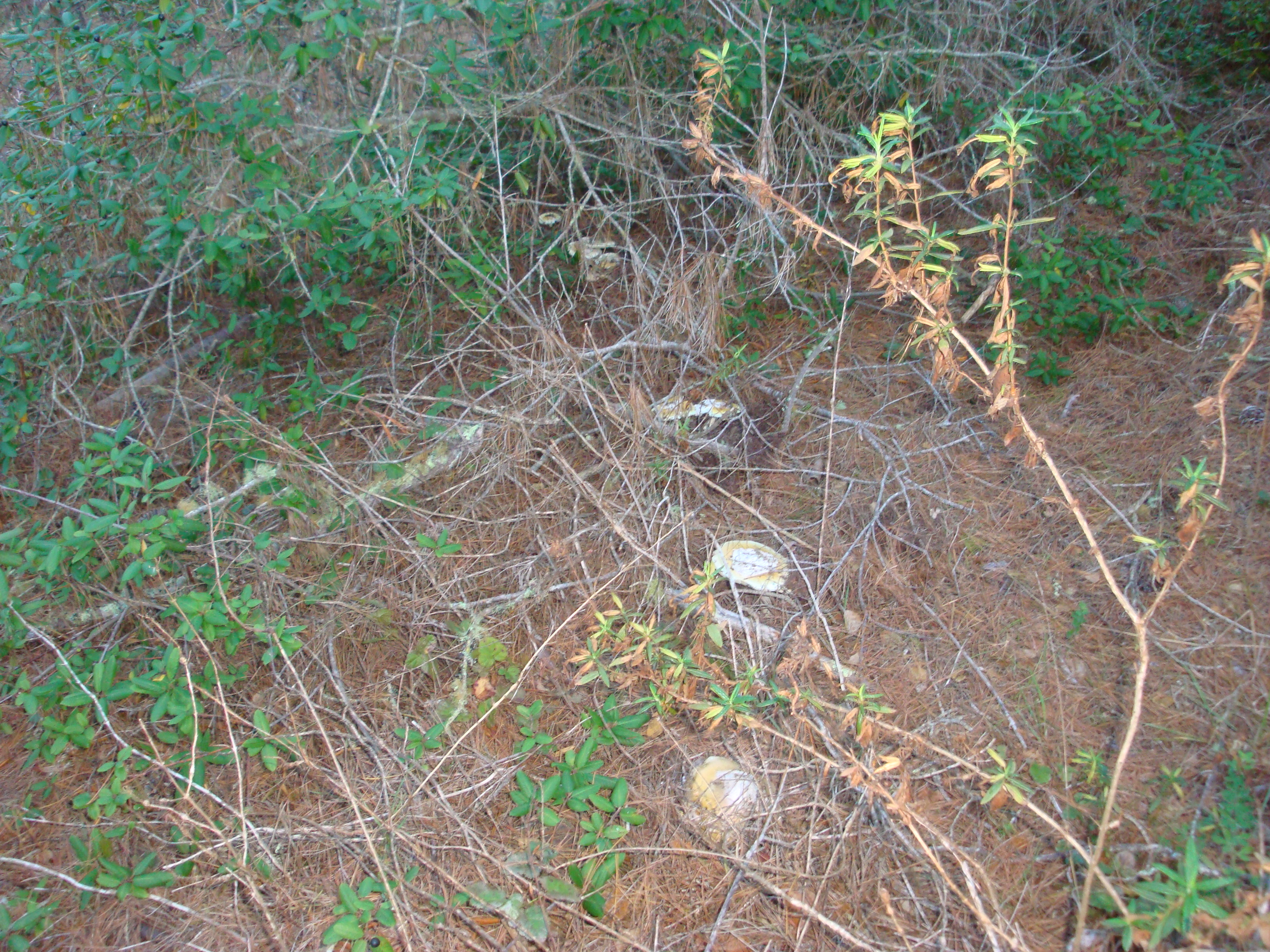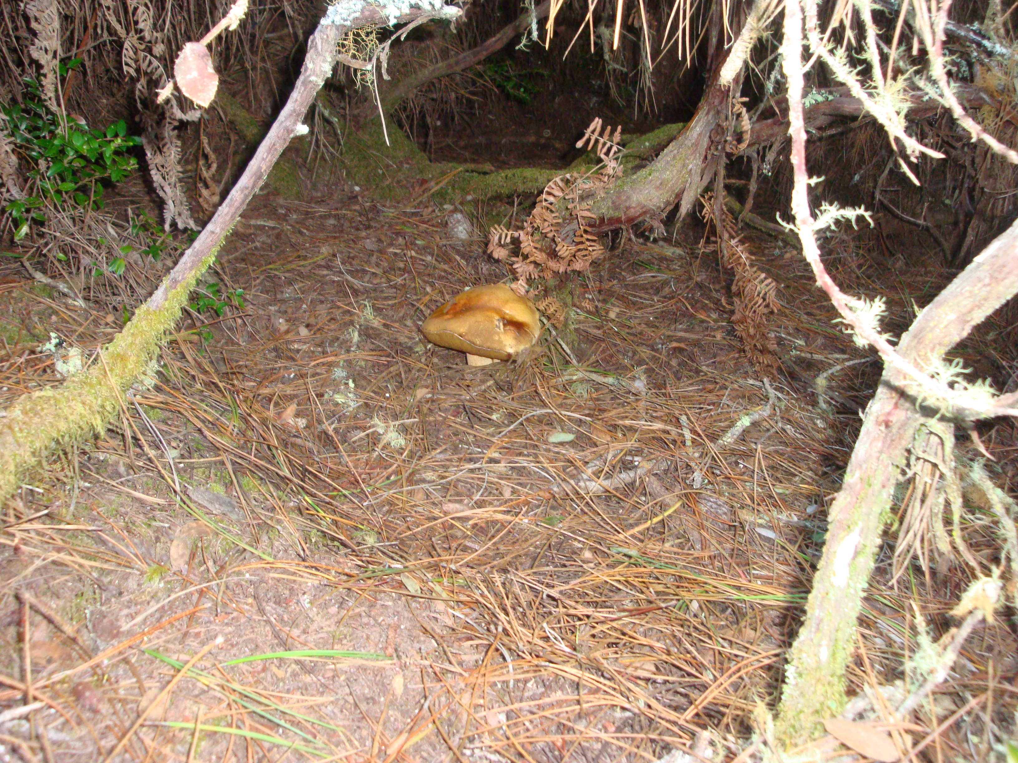 Now here’s something interesting. An large fairy circle of Amanita calyptroderma – a mushroom highly prized by Italians, who know it as Coccora. You can get an idea of the size of this circle by the gentle arc visible here. This circle was nearly complete and contained many dozens of Coccoras. A real bonanza for a Coccora aficionado.