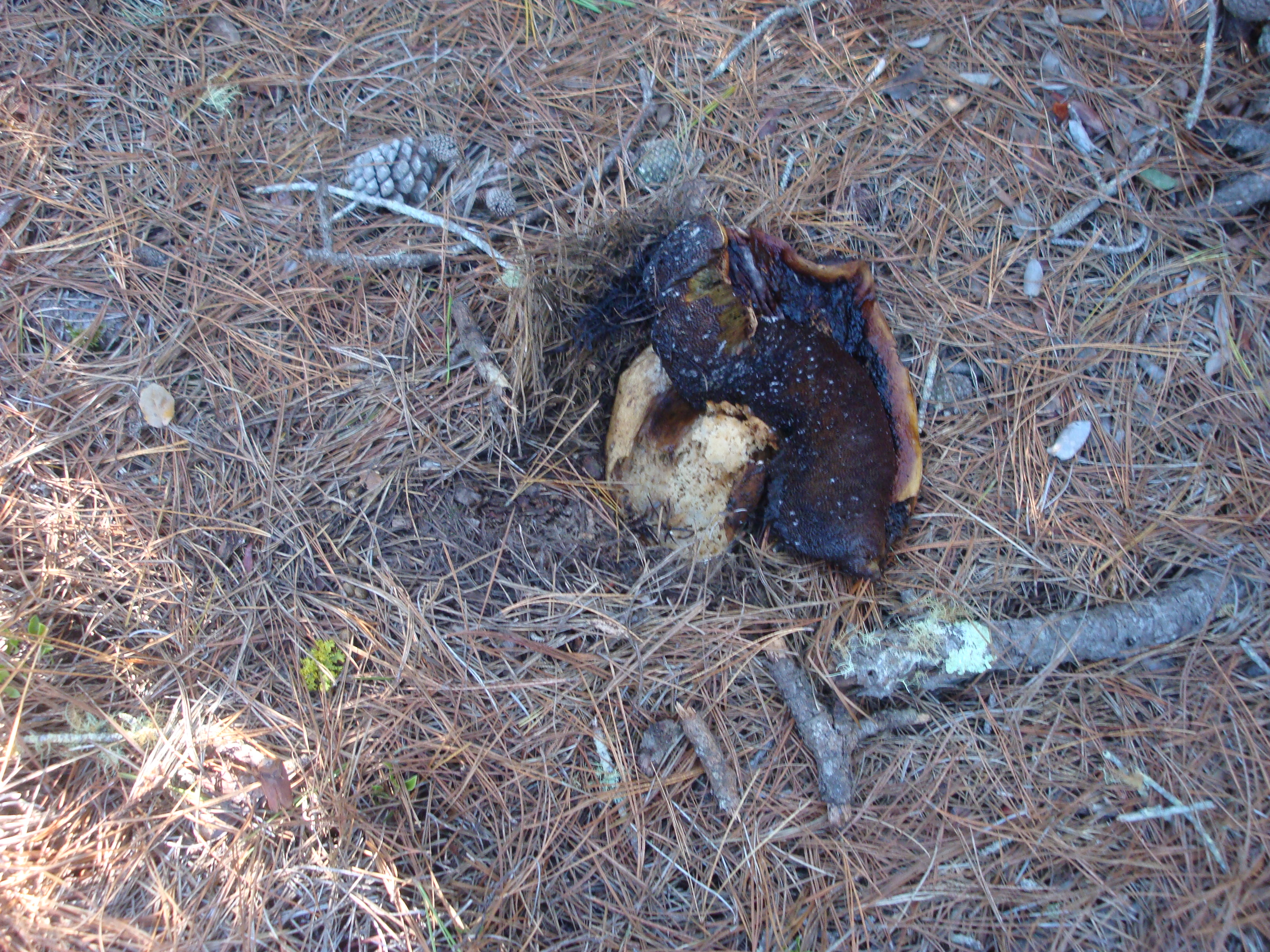 Well how do you like that? Two minutes after finding that someone had discovered and picked a mushroom we’d carefully hidden out in the brush, we stumble across a large, mature bolete growing only a foot from a trail heavily used by mushroom hunters. It was big enough and mature enough that it must have been in plain sight for days – yet it was still worm-free and in perfect condition. Go figure.