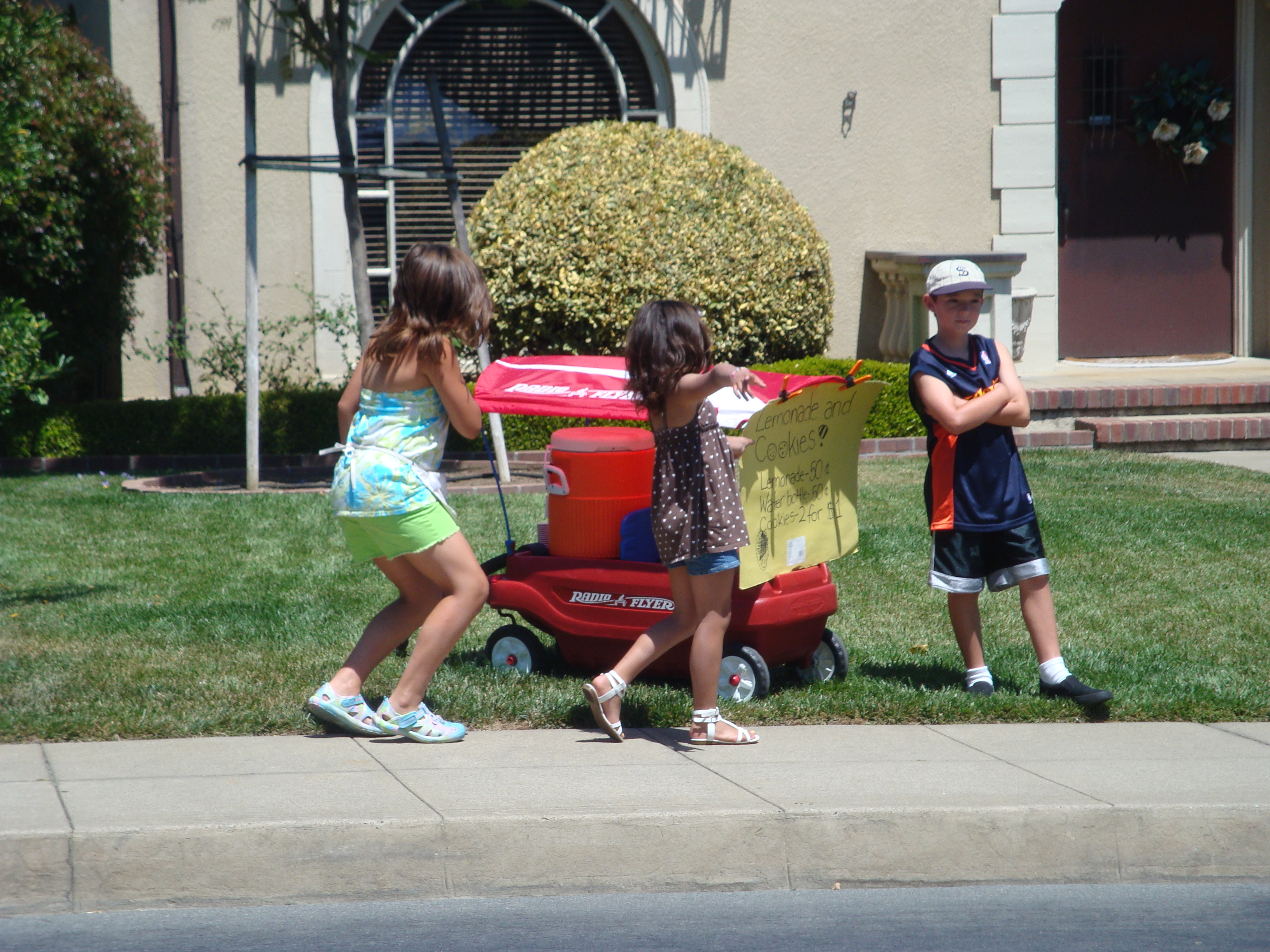 Small entrepreneurs wrestle a mobile lemonade stand into position near the finish line.