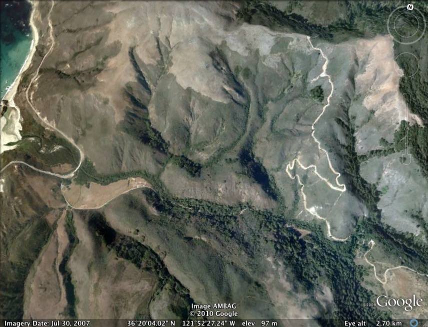 Google Earth view of Serra Grade (the white road cut near the right side of the image). Hwy. 1 at the mouth of the Little Sur River is visible on the left.