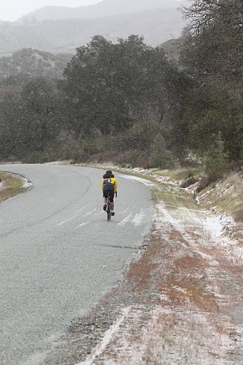 Saturday, February 26, 2011: The National Weather Service has issued a Winter Weather Advisory for snow down to only a few hundred feet above sea level. This might not seem like an ideal day for a bicycle ride down to Parkfield, in the far southeastern corner of Monterey County, but sometimes the least likely days turn out to be the best. In this case clear, crisp air, empty roads (drivers nearly all bundled up in front of their fires at home), many hours of bright sun, and a good snow storm on the final pass, add up to one of the best days on the bike we’ve had in years. Like the Birdman says, “There are no bad conditions, only bad clothing choices.”