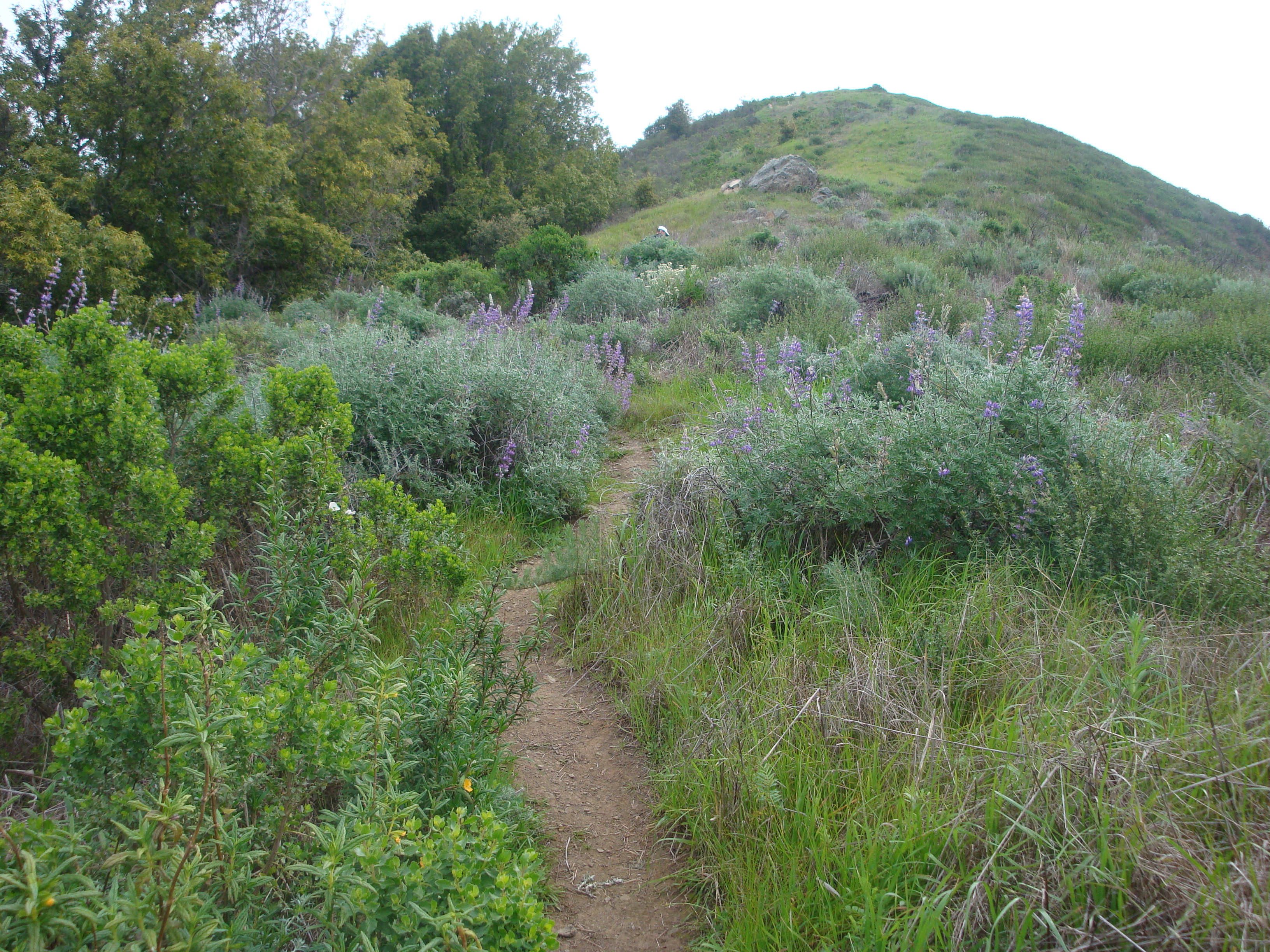 Silver lupine (Lupinus albifrons) lines the trail as it winds steeply upwards.