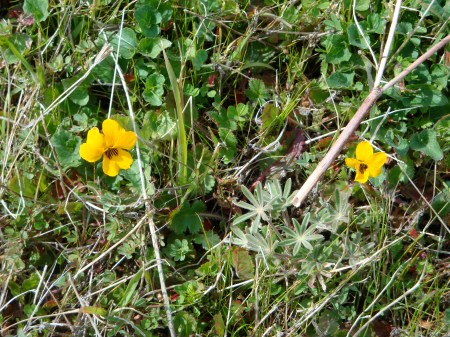 A silver lupine sprouts between two Johnny jump-ups (Viola pedunculata).