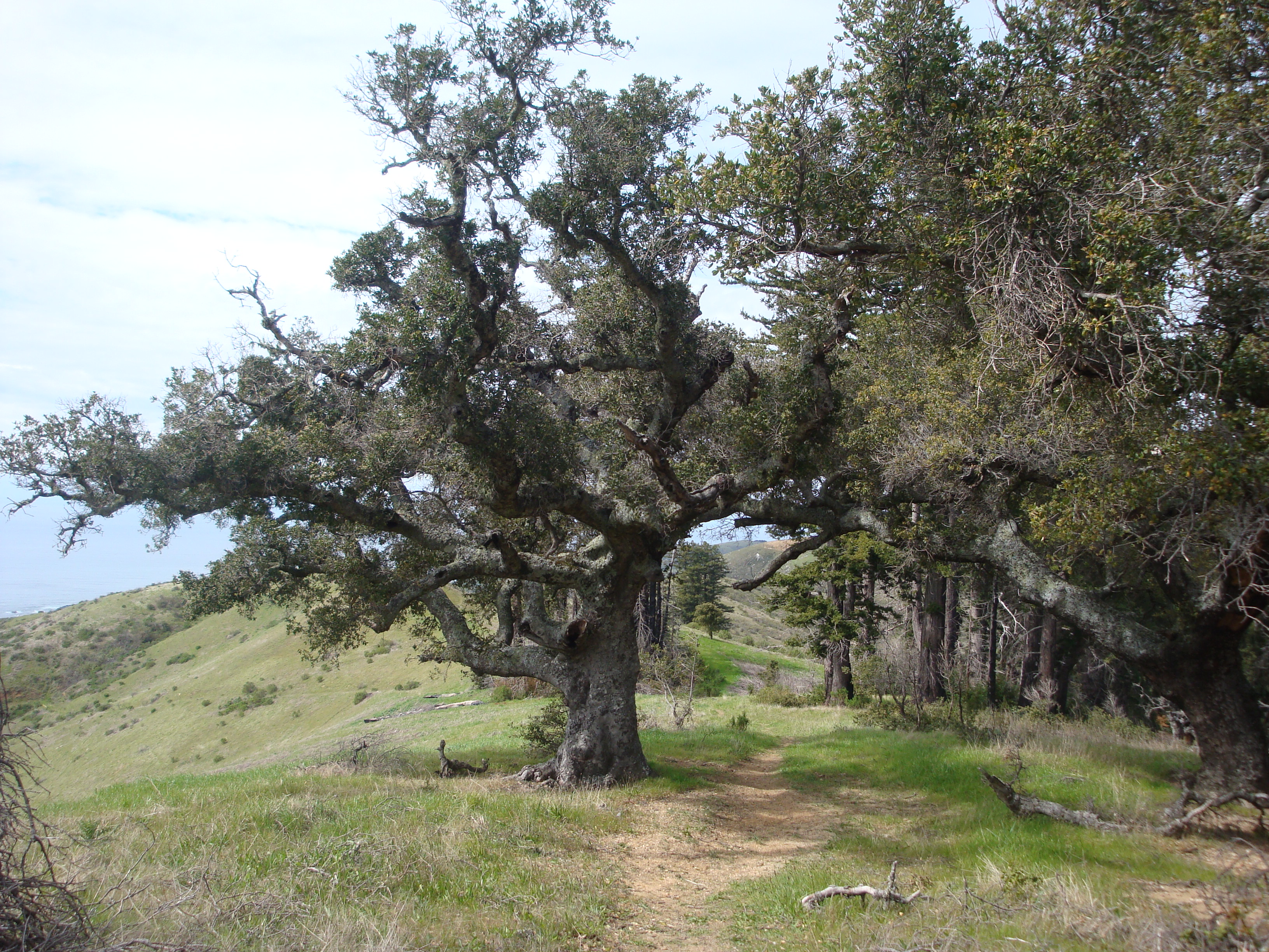 The trail reaches the top of the East Molera Ridge near groves of oak and redwood.