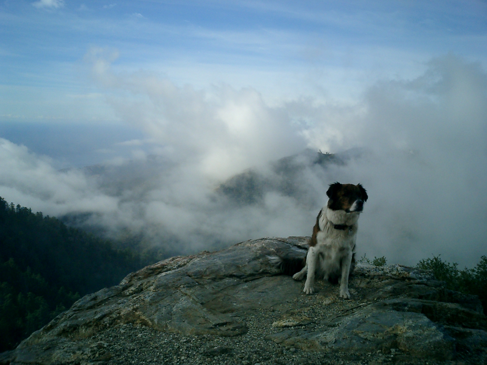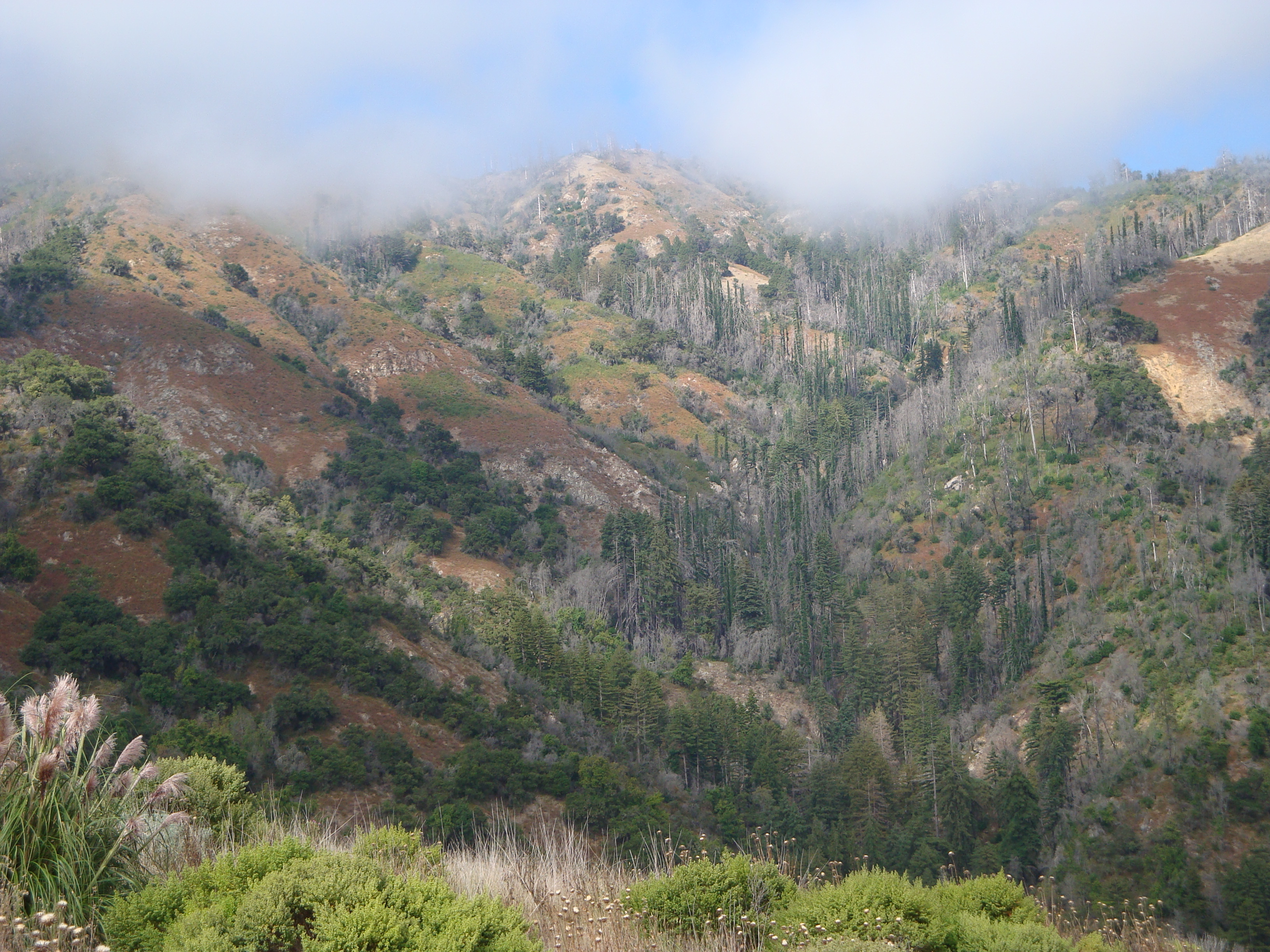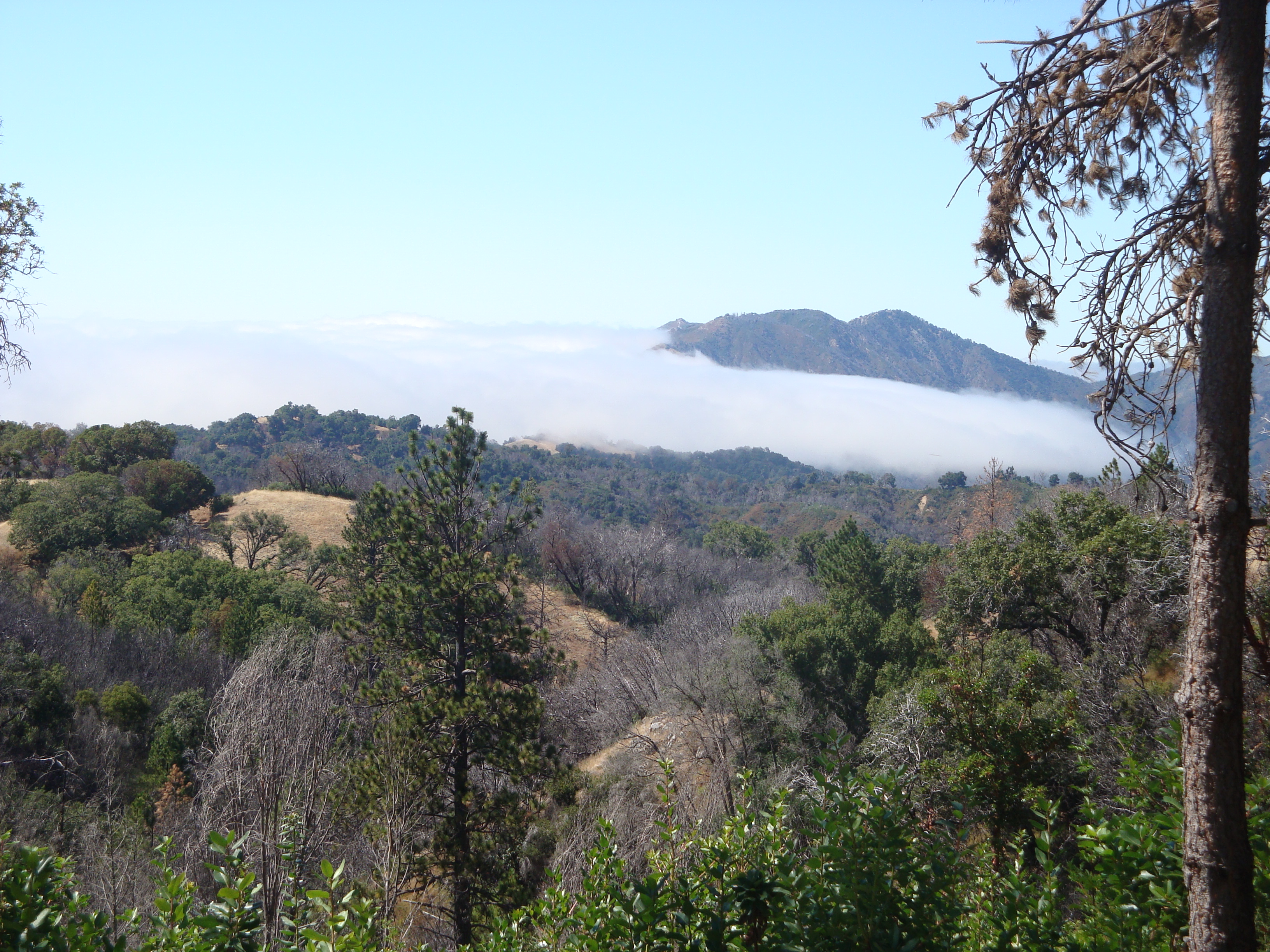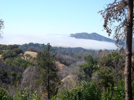 At the summit. View to the north from Timber Top on the Coast Ridge. A tongue of fog hanging over the Big Sur River Gorge with Mt. Manuel, etc. beyond.