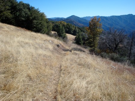 The trail soon leaves the creek and climbs to the top of Ponciano Ridge. The ridge is too heavily forested to provide much view, but this sign still survives in the gap. It’s only 3 miles out to the Robinson Canyon Rd. at White Rock from here, but the White Rock people shut down public access ages ago and are known to be quite unwelcoming to confused hikers who wander out of the Wilderness along this trail.