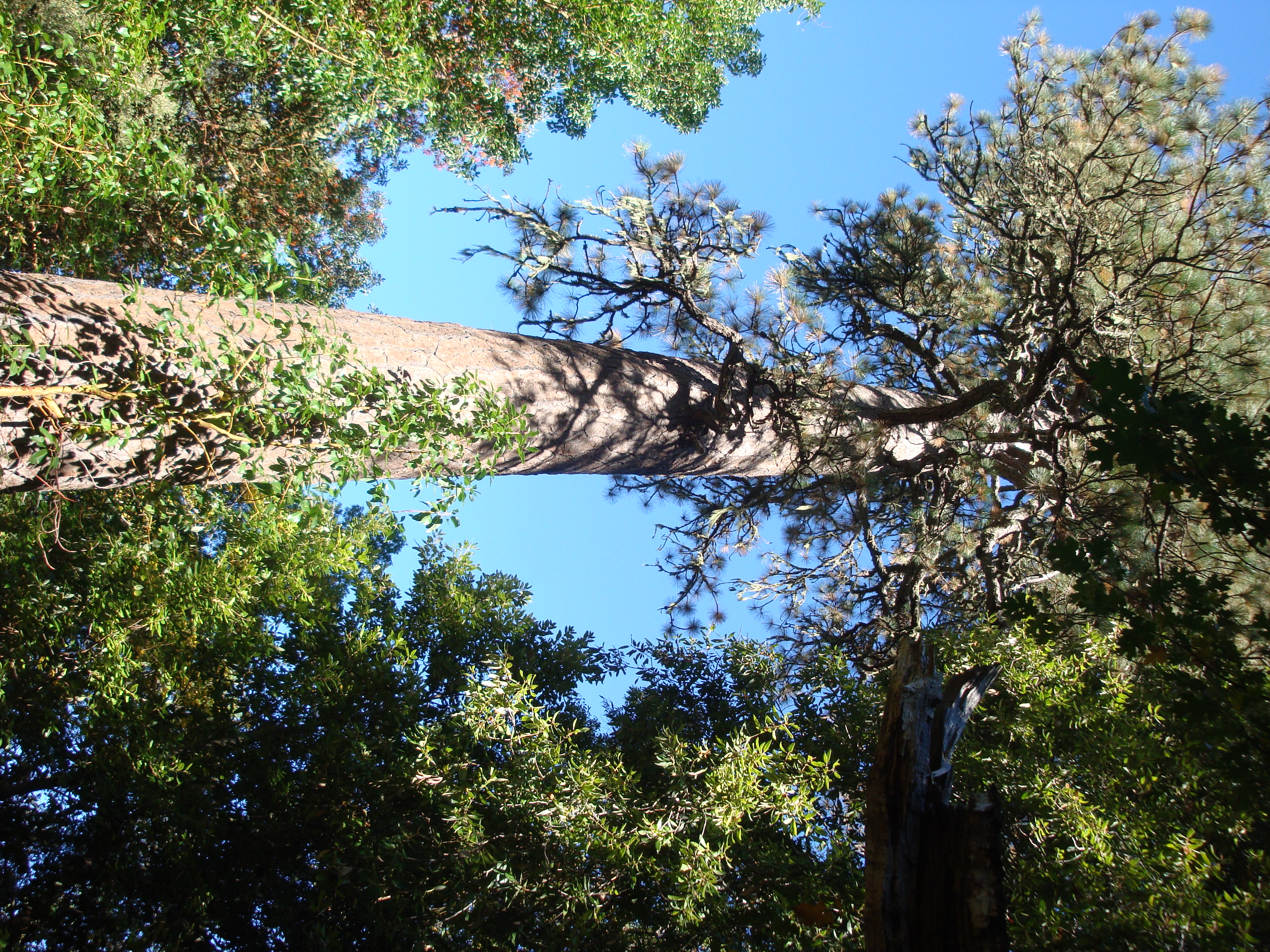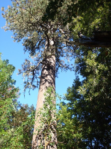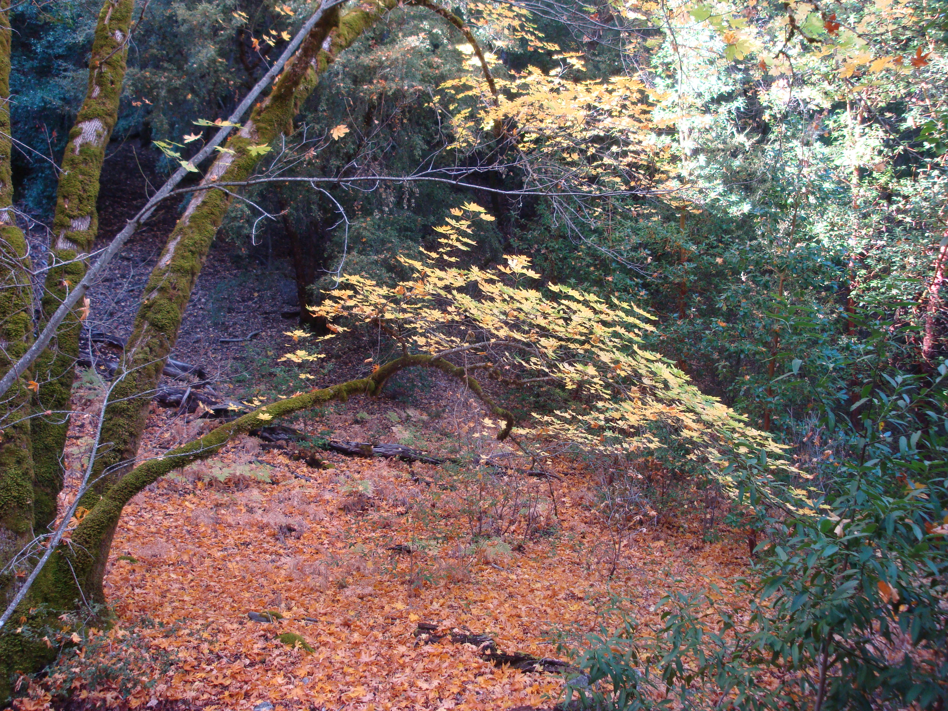 There isn’t a pine woods along Pine Creek, but huge ponderosas (Pinus ponderosa) are scattered about in the hardwood forest. We were surprised to see large healthy stands of old tanbark oaks (Notholithocarpus densiflorus – that’s right, they’ve been moved to a new genus. Just weren’t closely enough related to the other Lithocarpuses, or something). Thanks to Sudden Oak Death (Phytophthora ramorum) infestation, healthy tanbark forests are now a rare sight in the Santa Lucia Mountains.