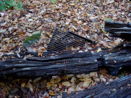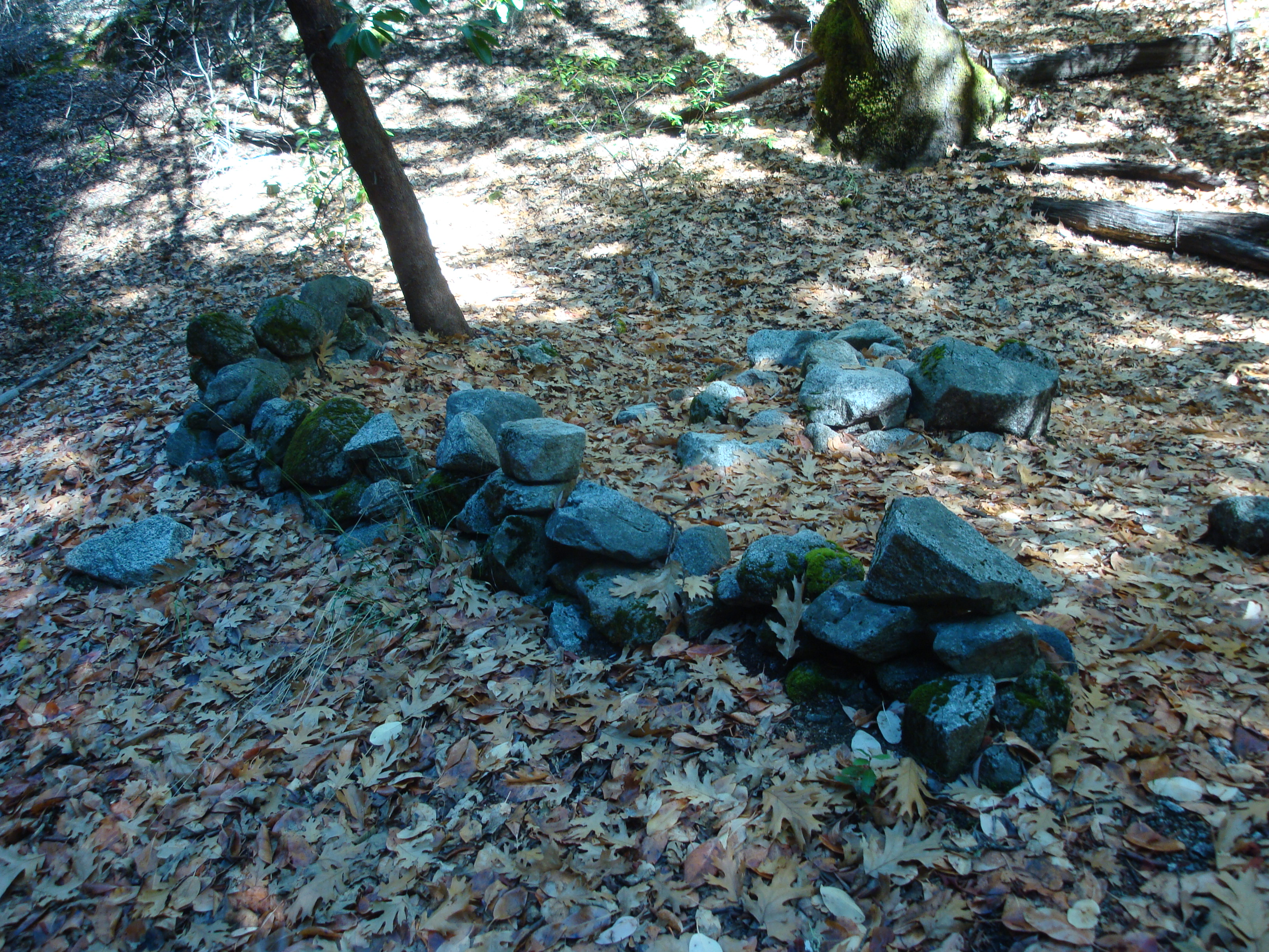 The fire grate at the official Pine Creek Camp was crushed long ago by a falling madroño.