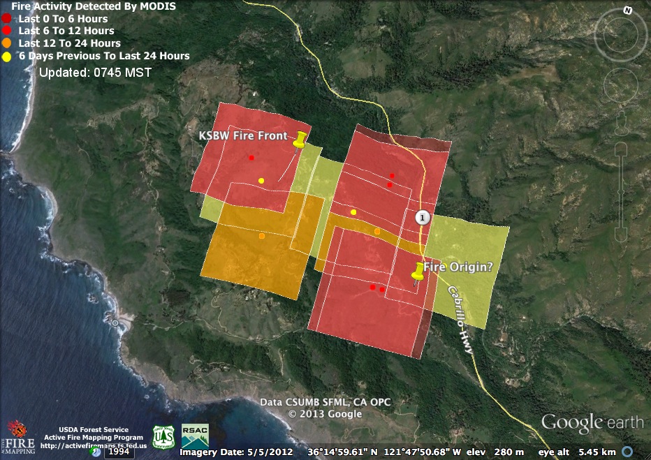 A heavy smoke layer has now reached Carmel and the Monterey Peninsula. No heat detections have yet appeared on the MODIS maps.