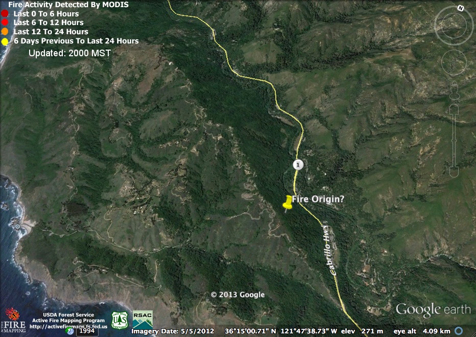 2:20 pm 12/17/13 Update: No new heat detections have yet been posted, but we’ve moved our “Ignition Point?” pin to better reflect the current belief that the fire started near the Buzzard’s Roost Trailhead or the State Park Group Camping Area (both of which are near the Hwy. One bridge over the Big Sur River).