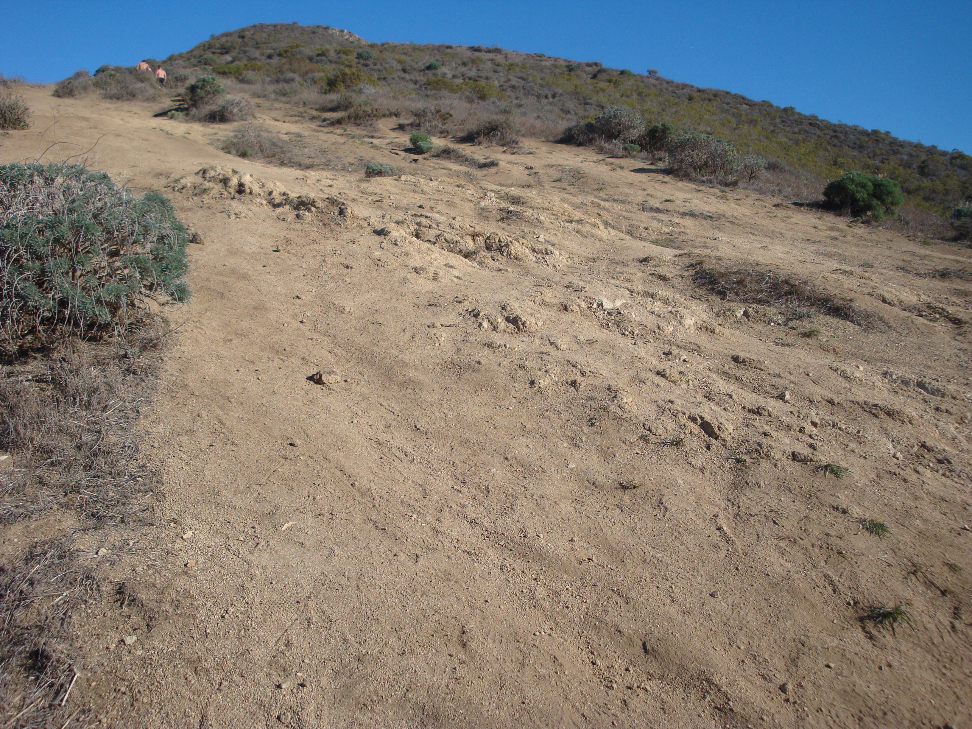 The extreme steepness makes the trail slippery. People walk on the edge of the trail to gain better traction. Over time, the trail grows wider and wider. When heavy rains return, erosion is likely to be spectacular.