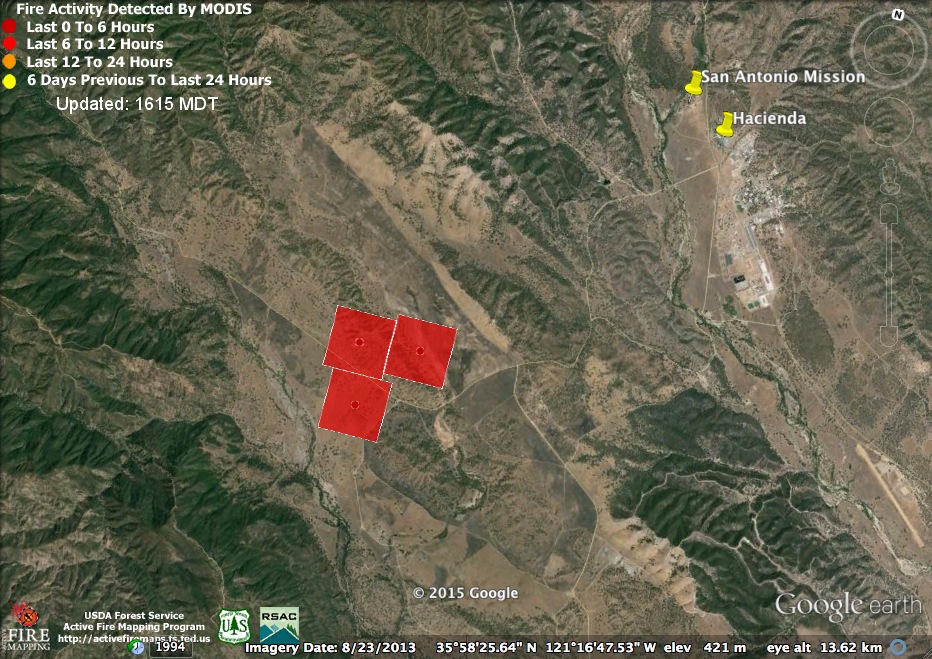 Presumably as a result of yesterday’s lightning, there is at least one fire, dubbed the Peanut Fire, now burning at Ft. Hunter Liggett. The fire is said to be in the Stony Valley area, along the Nacimiento-Fergusson Rd. That would correspond with the upper three heat detections shown above. No telling whether the lower detections are a separate fire or not.