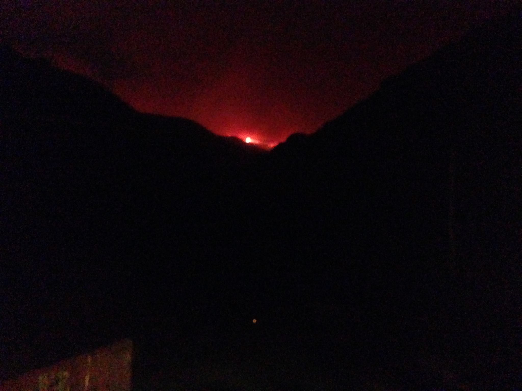 This photo of flame at the headwaters of Joshua Canyon, taken by Martha Diehl earlier this evening, would seem to confirm the movement of fire along the ridge linking Palo Corona to Mt. Carmel.