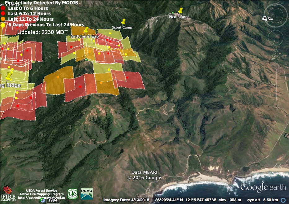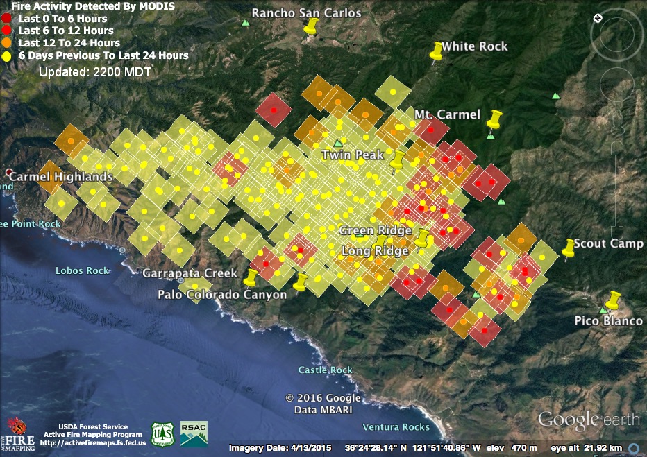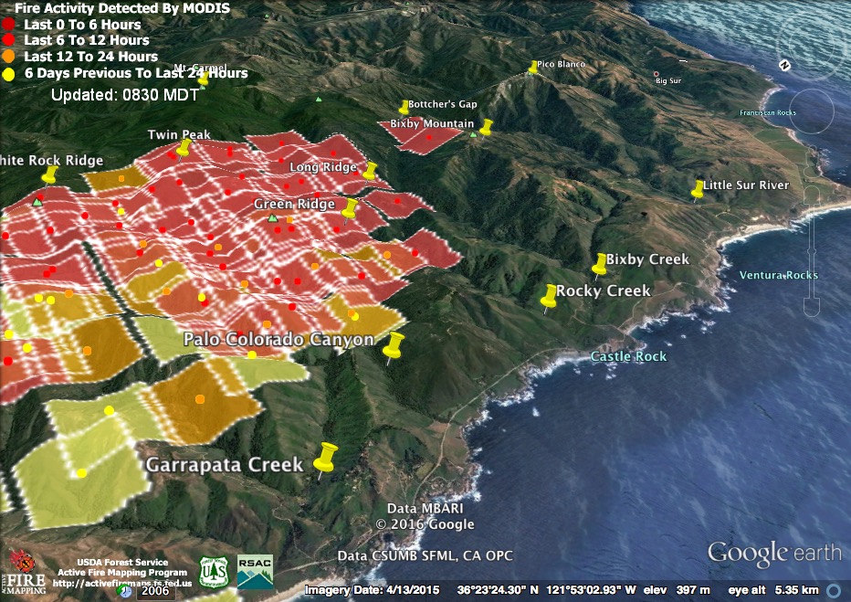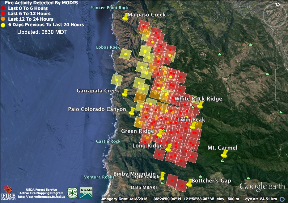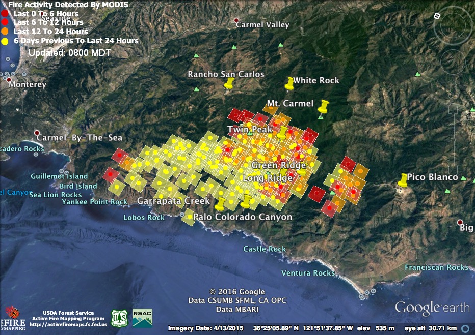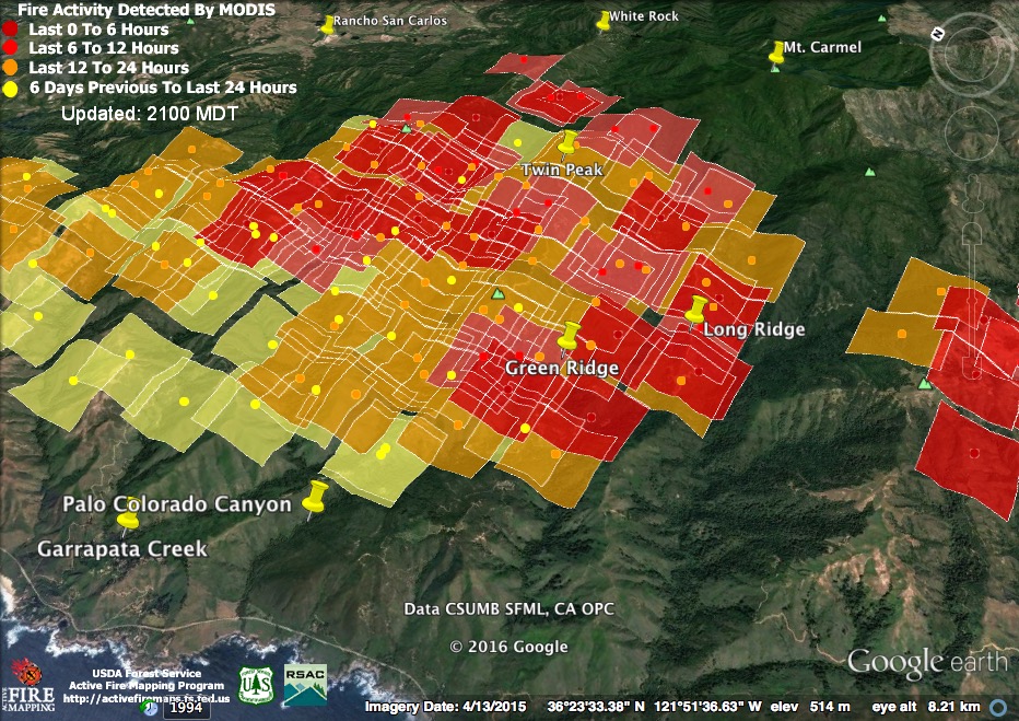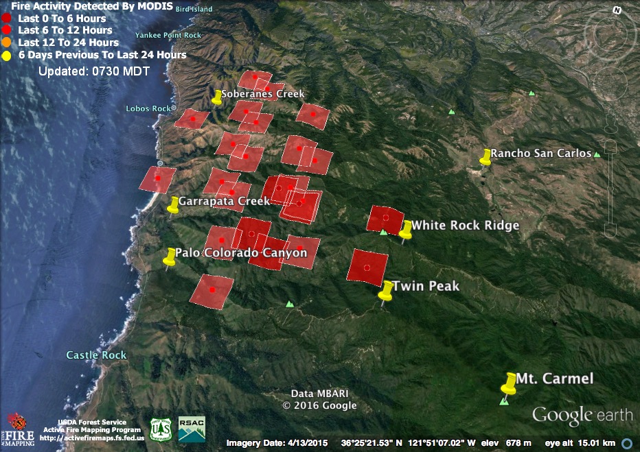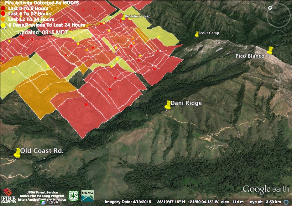 The satellite found heat advancing down Garrapata and Bixby Creeks, as well as in the Palo Colorado, Green Ridge, Long Ridge, and Mescal Ridge areas at 11:30 pm last night, but only in the Long Ridge area by 3:30 am.