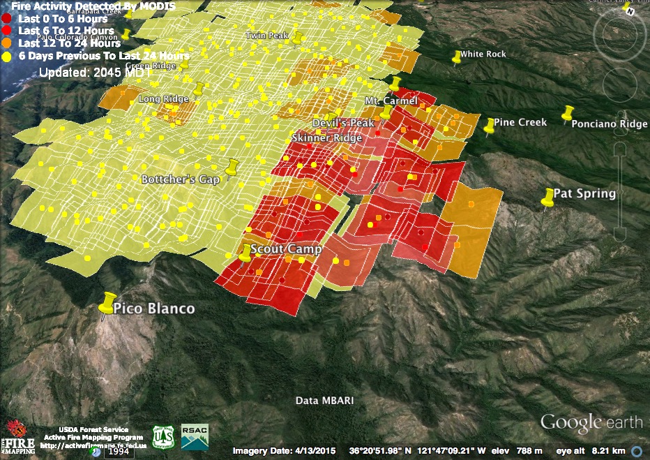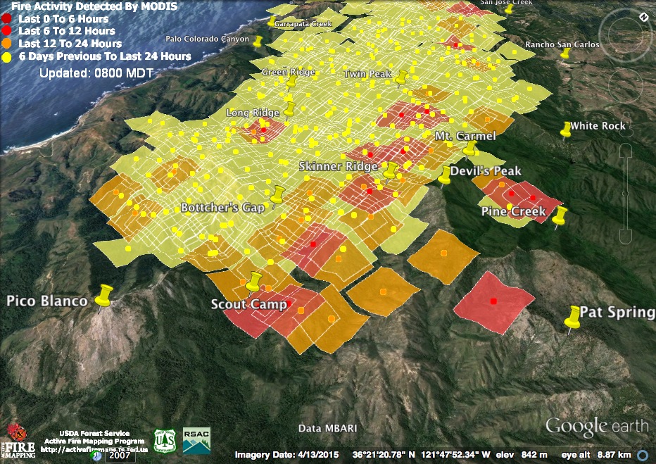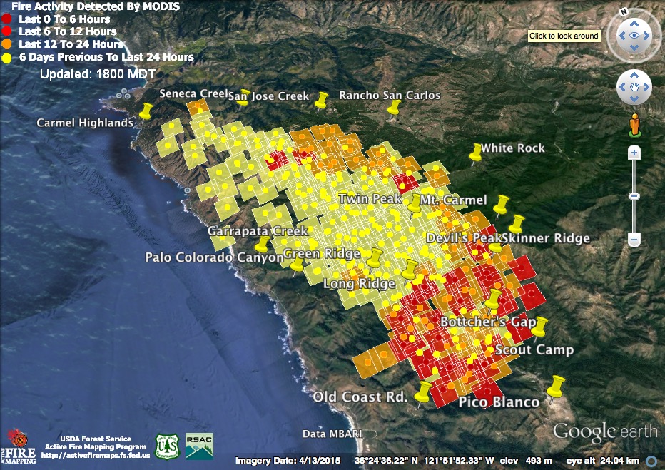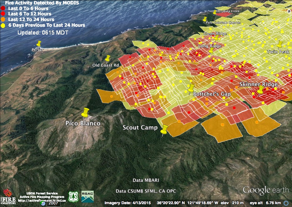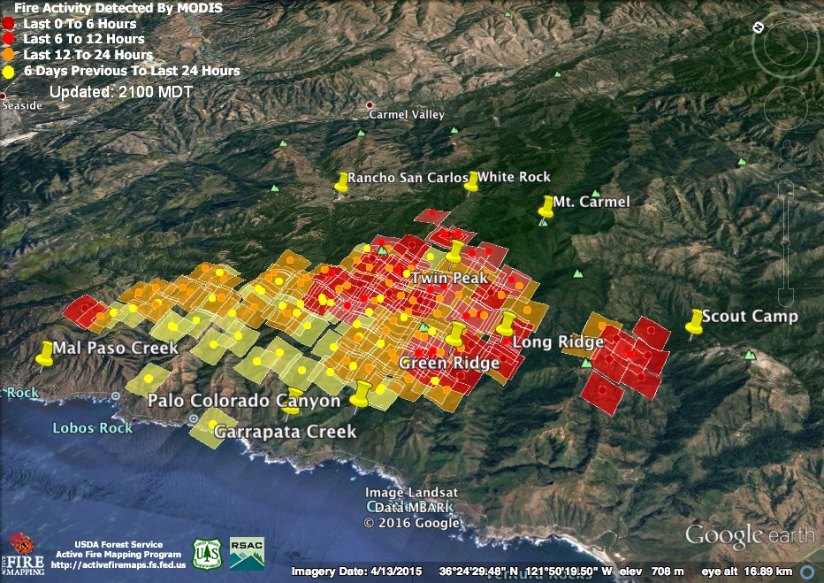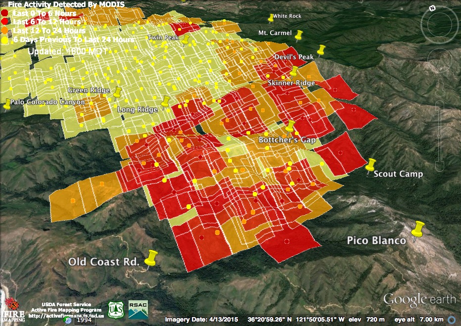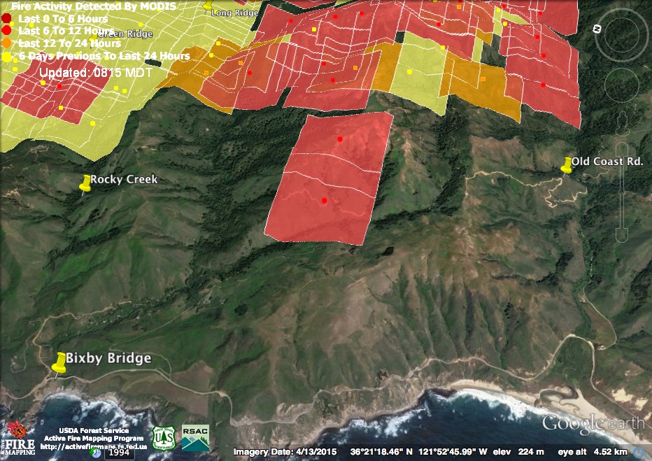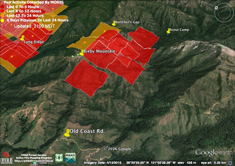 The satellite found heat advancing down Garrapata and Bixby Creeks, as well as in the Palo Colorado, Green Ridge, Long Ridge, and Mescal Ridge areas at 11:30 pm last night, but only in the Long Ridge area by 3:30 am.