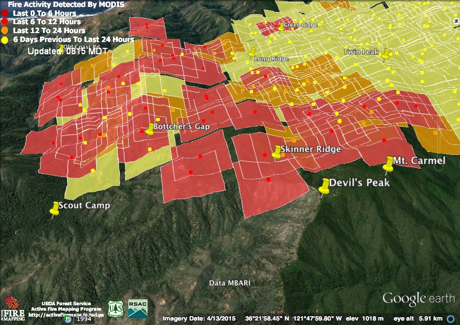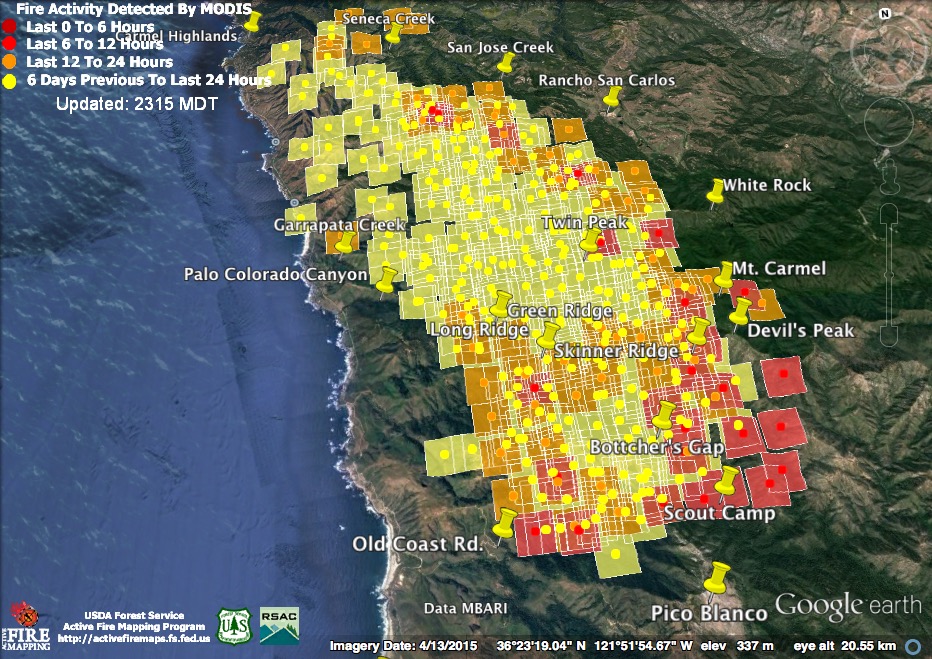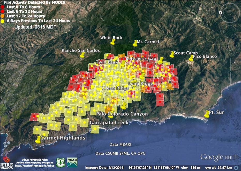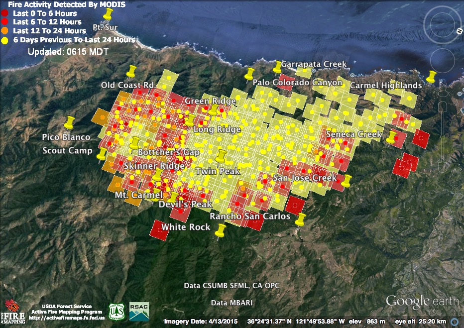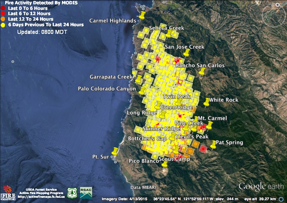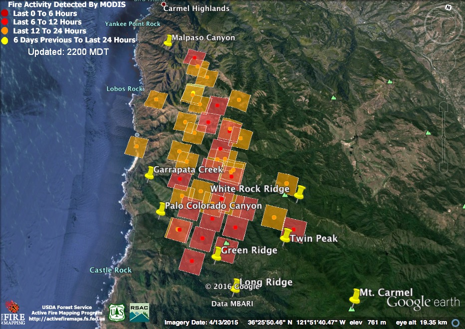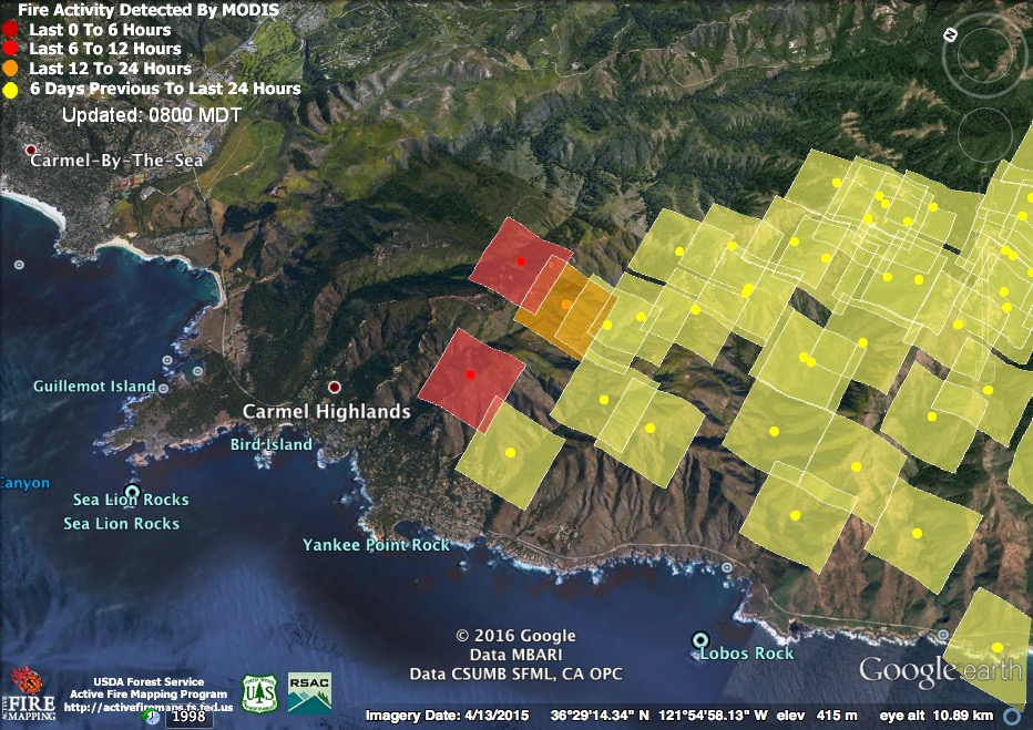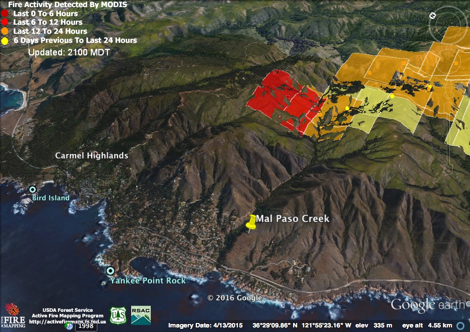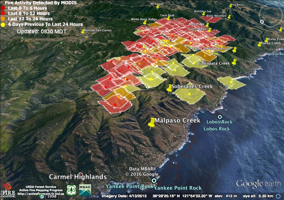 The bad news is that at 11:30 pm the satellites found the north end of the fire still expanding above the Carmel Highlands. The good news is that at 4:00 am the satellites failed to detect heat there. That doesn’t mean the fire is out or no longer a threat, but it is an indication that it was burning much less intensely than it had been at 11:30. The satellites often fail to detect fire that is burning at a slow rate. Fire is smoldering and creeping in many canyons along the coast right now, for example, but there are no heat detections in those locations.