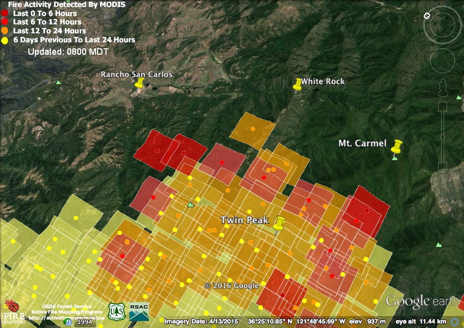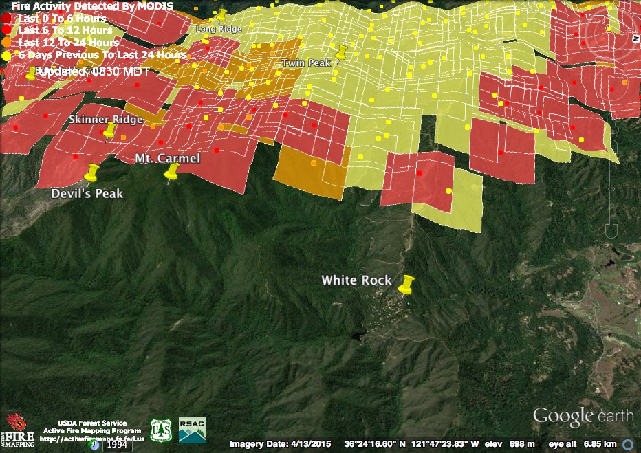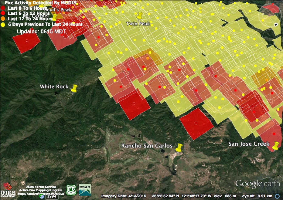 More good news is that the satellites failed to find any indication of fire actively advancing toward the cabins at White Rock overnight. The 4:00 am pass did find fire burning toward Mt. Carmel and in the hills above Rancho San Carlos, and these flame fronts have likely continued to advance.