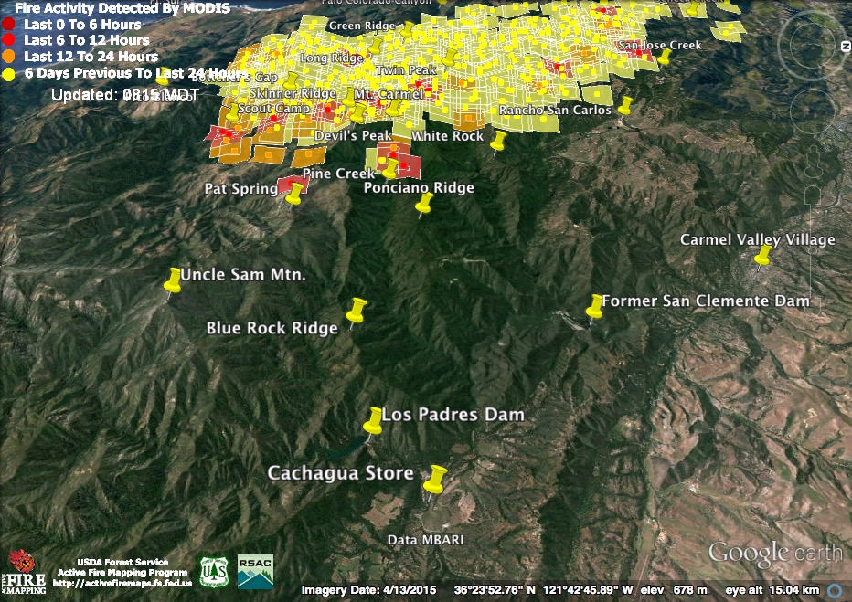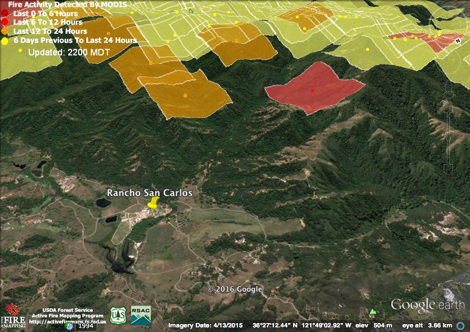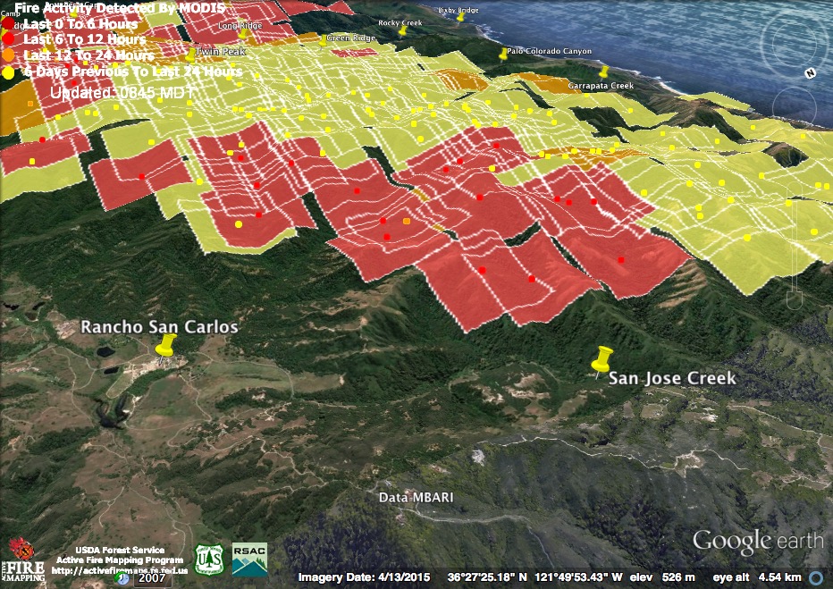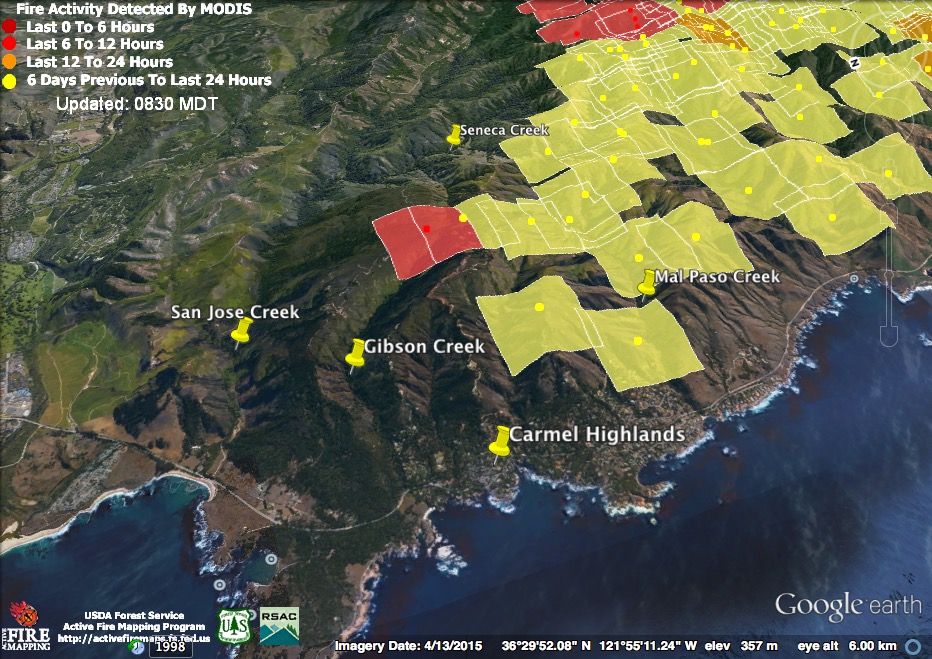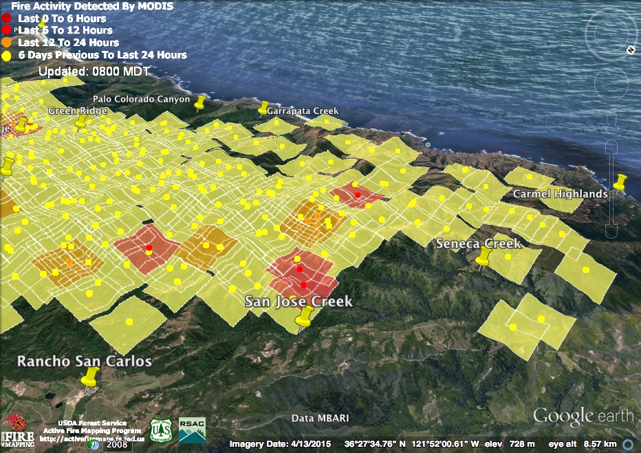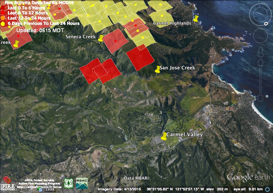 These heat detections suggest the fire behind the Carmel Highlands has advanced north to San Jose Creek – and that it was burning quite briskly there at 3:30 this morning. There were reports that fire had gotten over the line in this area yesterday and was being contained within secondary lines. Hopefully these detections indicate fire still within those secondary lines.