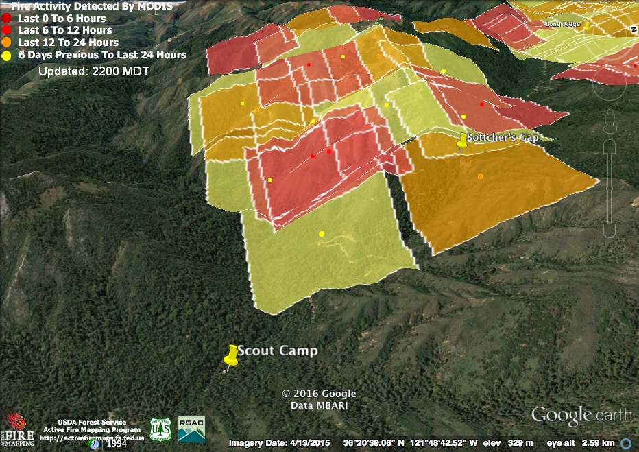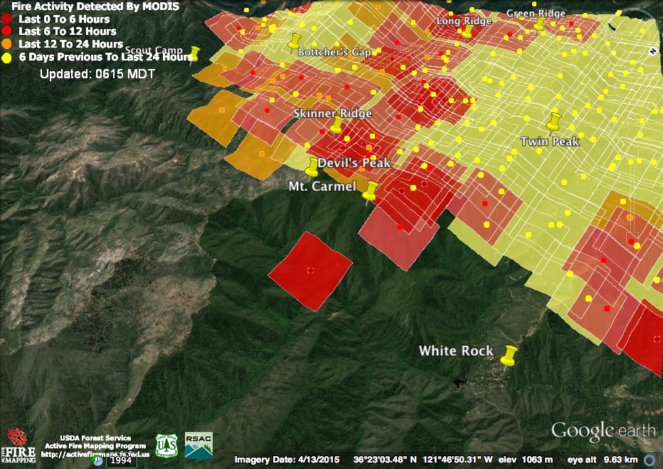 The lighter red squares are where fire was detected at around 11:15 last night as the fire was making its big run. The darker squares were detected at about 2:50 this morning. This shows that, in general, things had cooled down by then, but that the fire was still very active on the higher ridges.